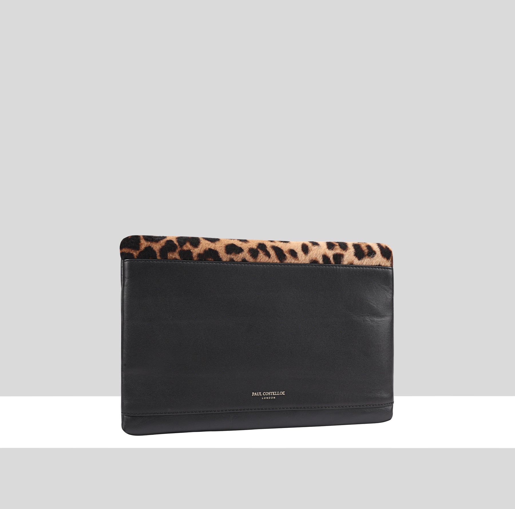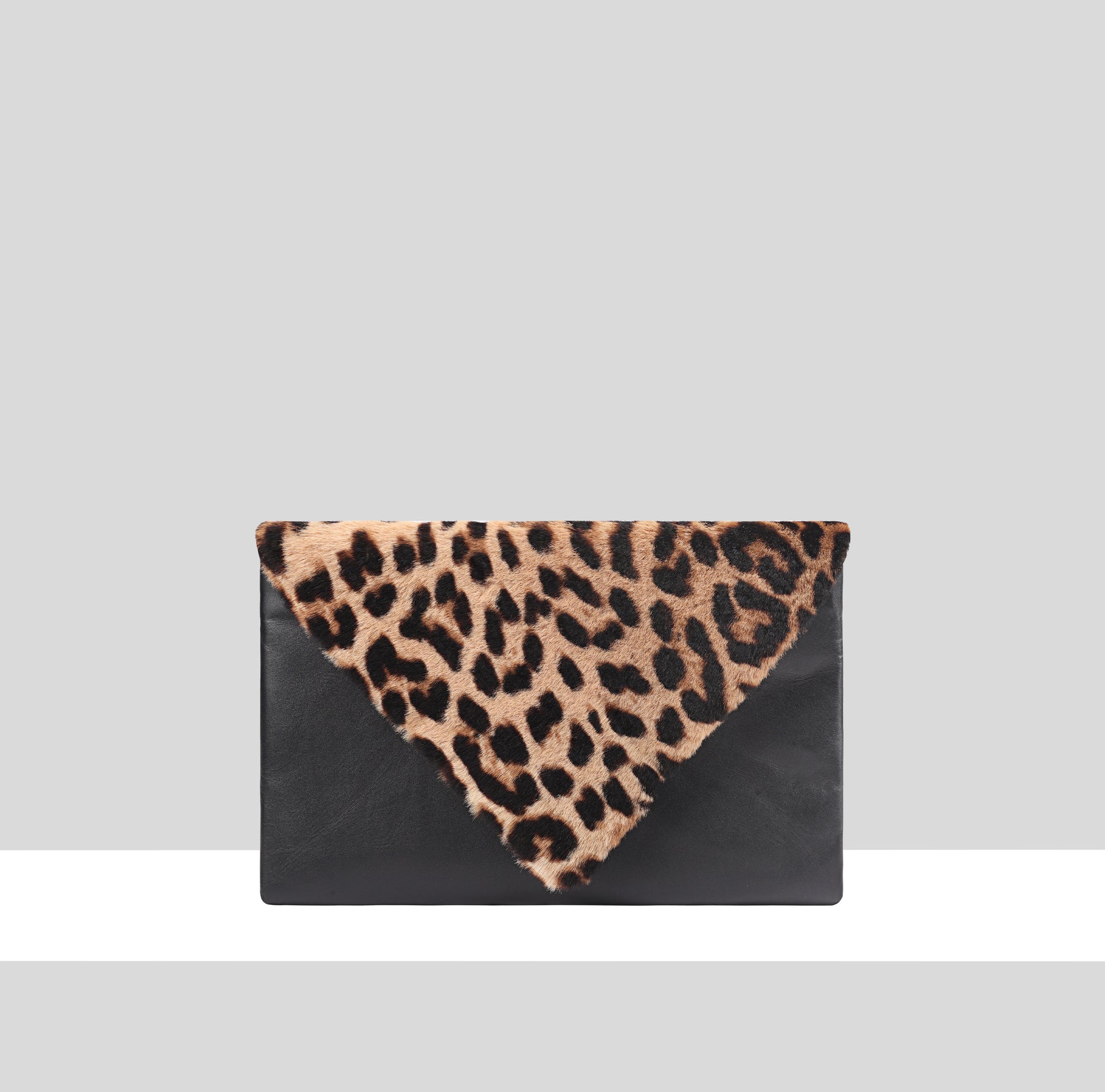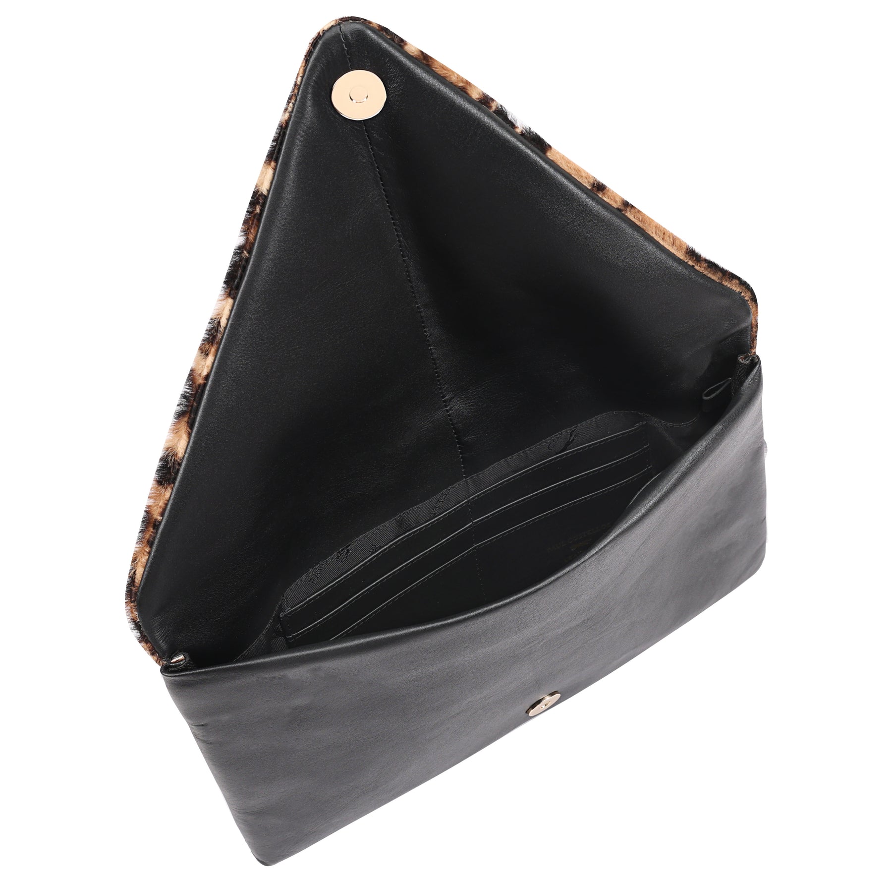 The PAUL COSTELLOE Fiora clutch is a striking blend of luxury and bold design. Crafted in smooth black leather with a dramatic leopard-print hair-on flap, it brings instant glamour to any look. The magnetic closure opens to a sleek, well-organized interior, making it both elegant and practical for evenings out or special occasions.