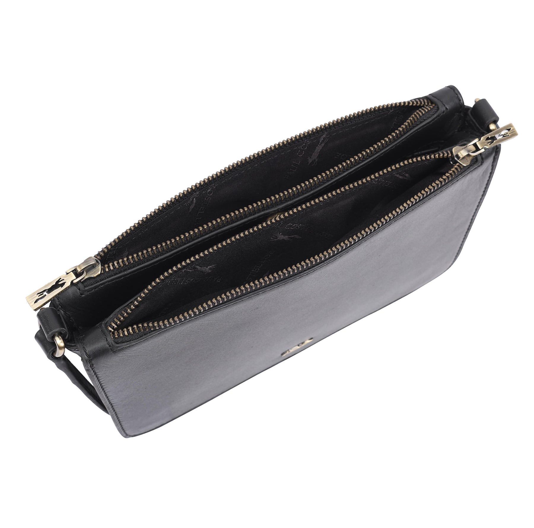 This sleek crossbody bag, crafted from luxurious leather, exudes timeless sophistication. It features twin zipped compartments and a central slip pocket with a magnetic closure for effortless organization. The adjustable shoulder strap ensures a comfortable, customizable fit, while a stylish hanging charm with a key ring adds a chic and functional accent. Perfect for elevating any outfit.