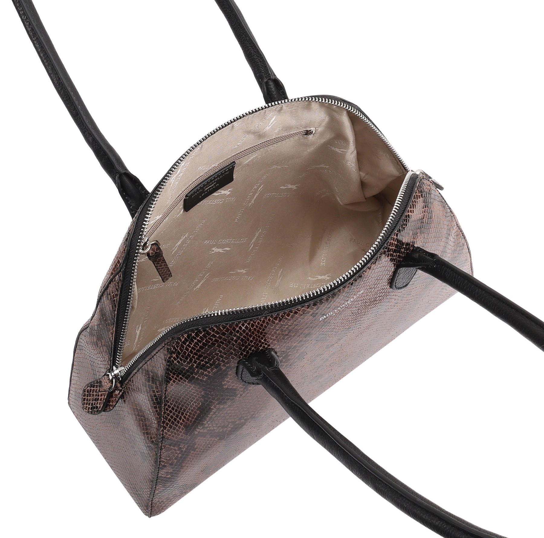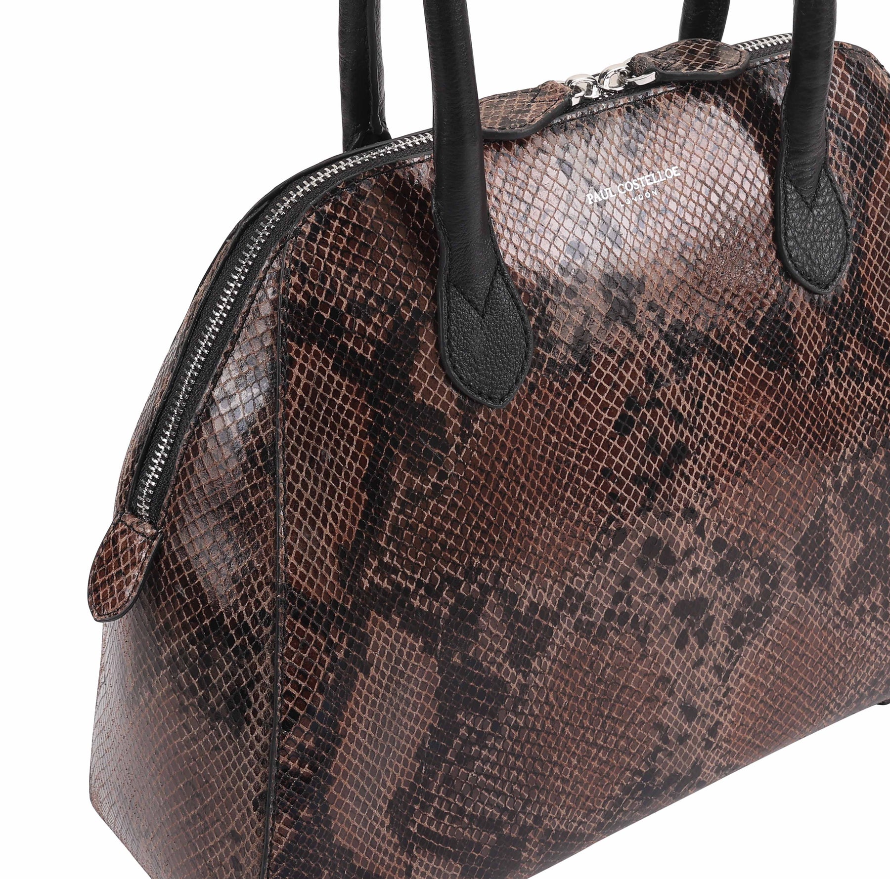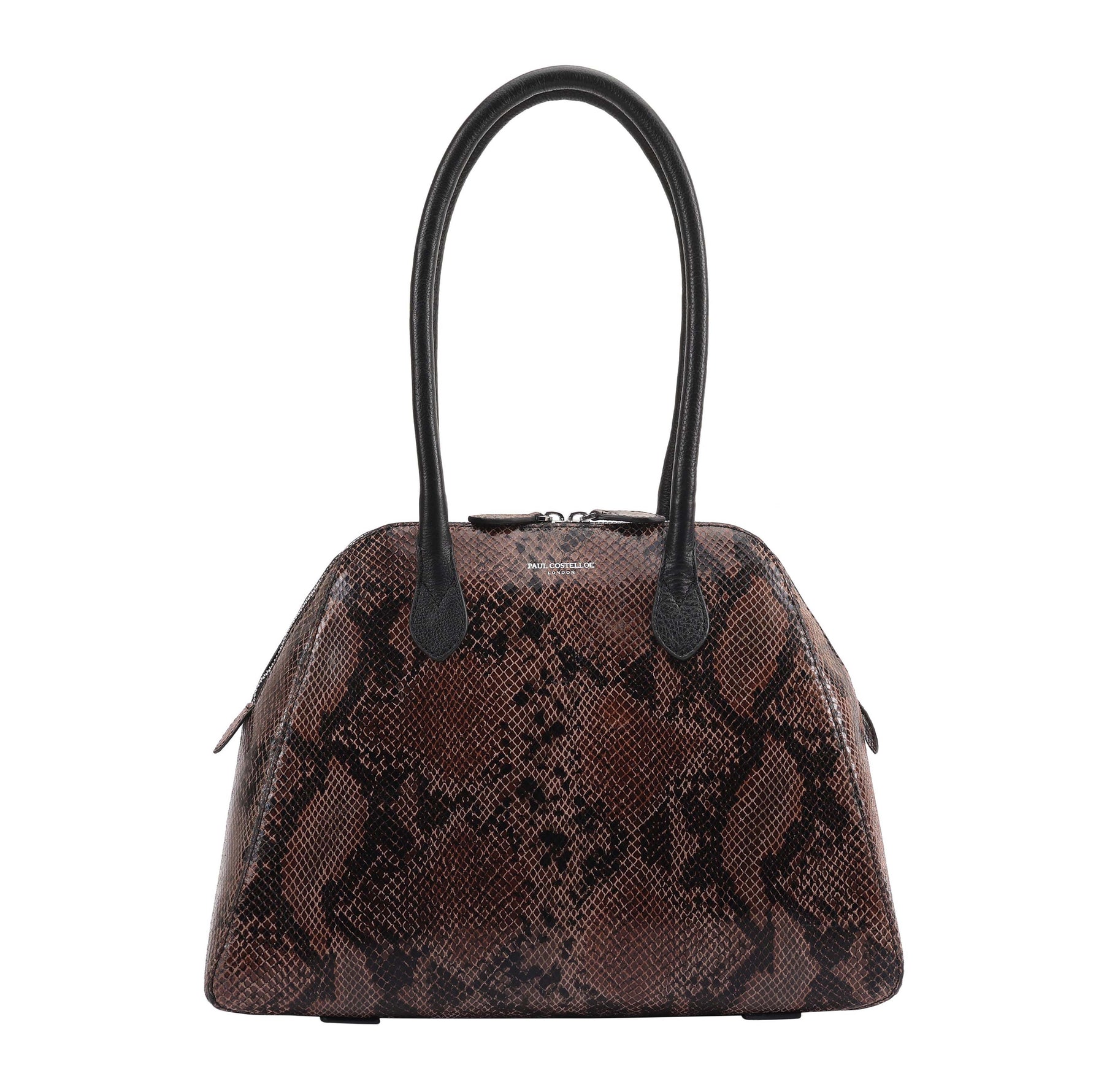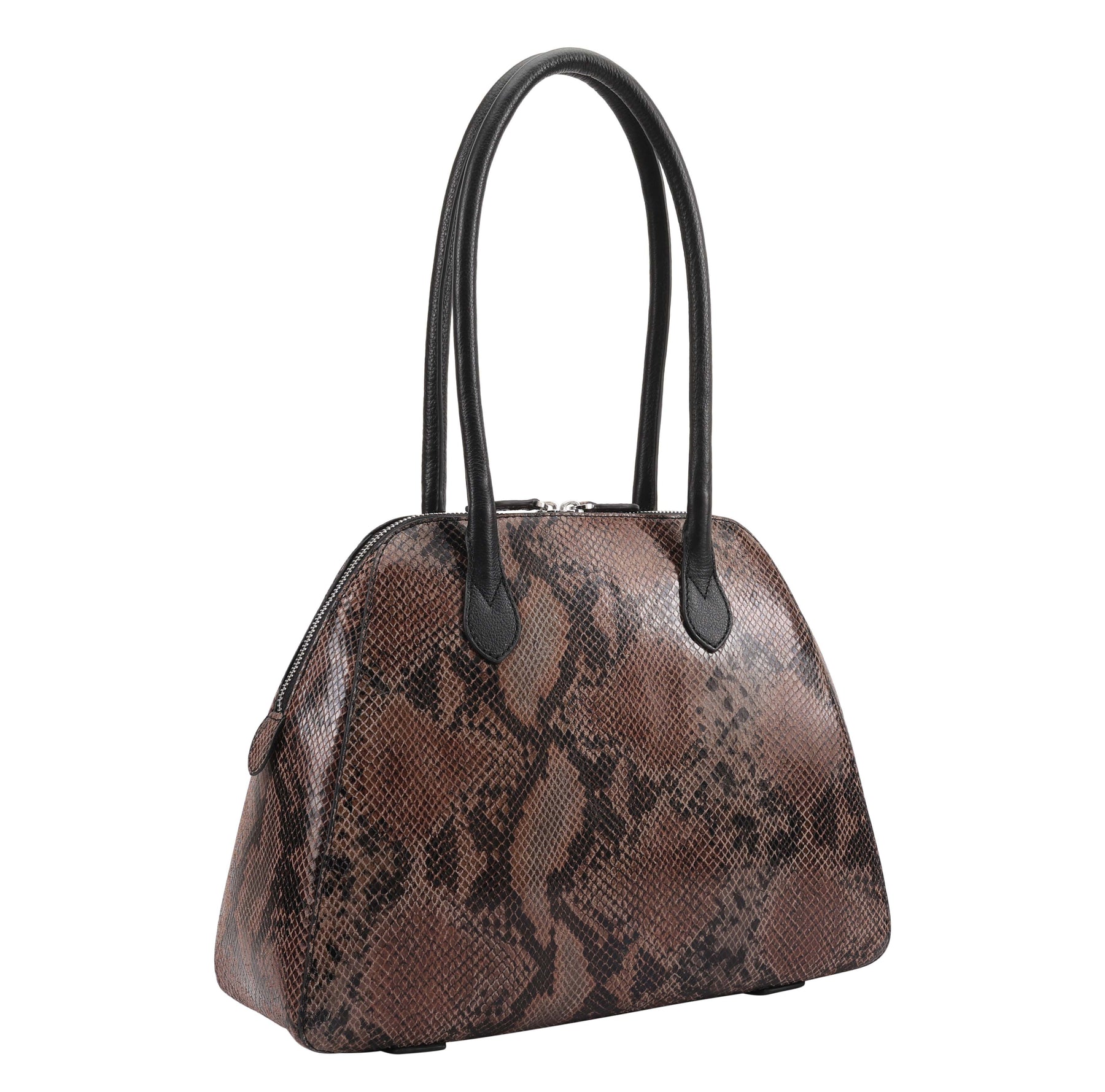 A sleek leather shoulder bag with a clean profile, designed with long shoulder handles and secure double-zip closure. Crafted from premium python printed leather, it opens to a spacious interior featuring slip and zipped pockets for your mobile and small essentials. Ideal for modern women on the go-perfect for work or travel..