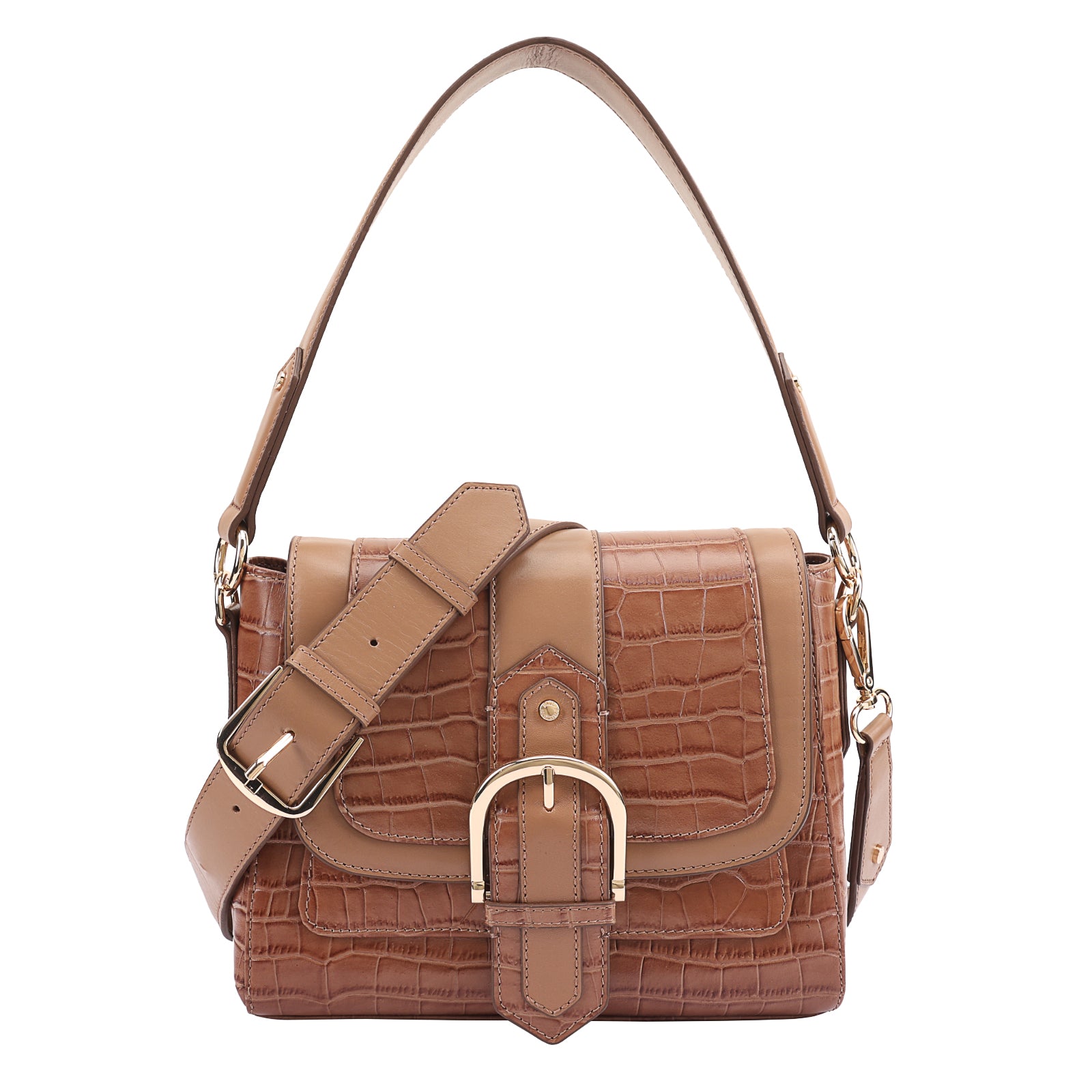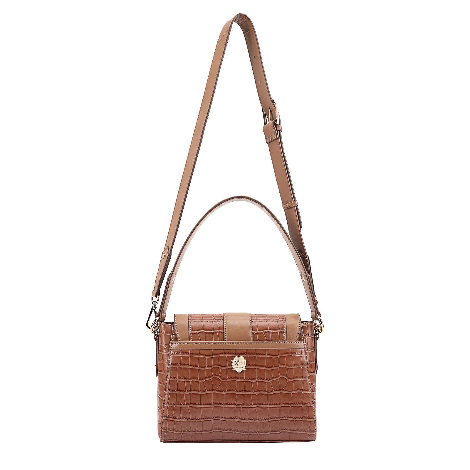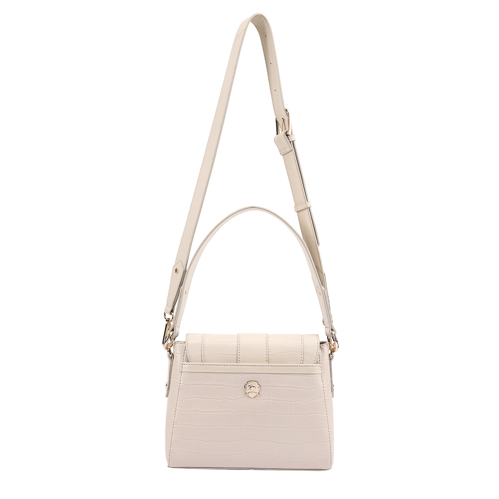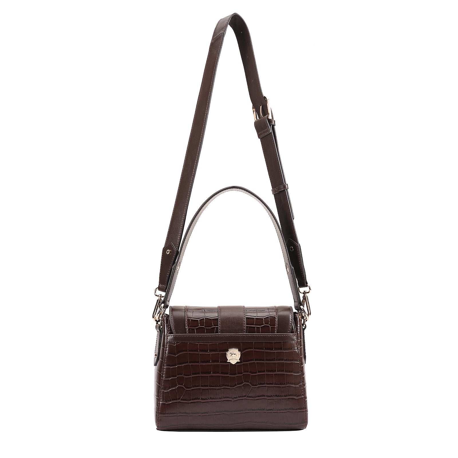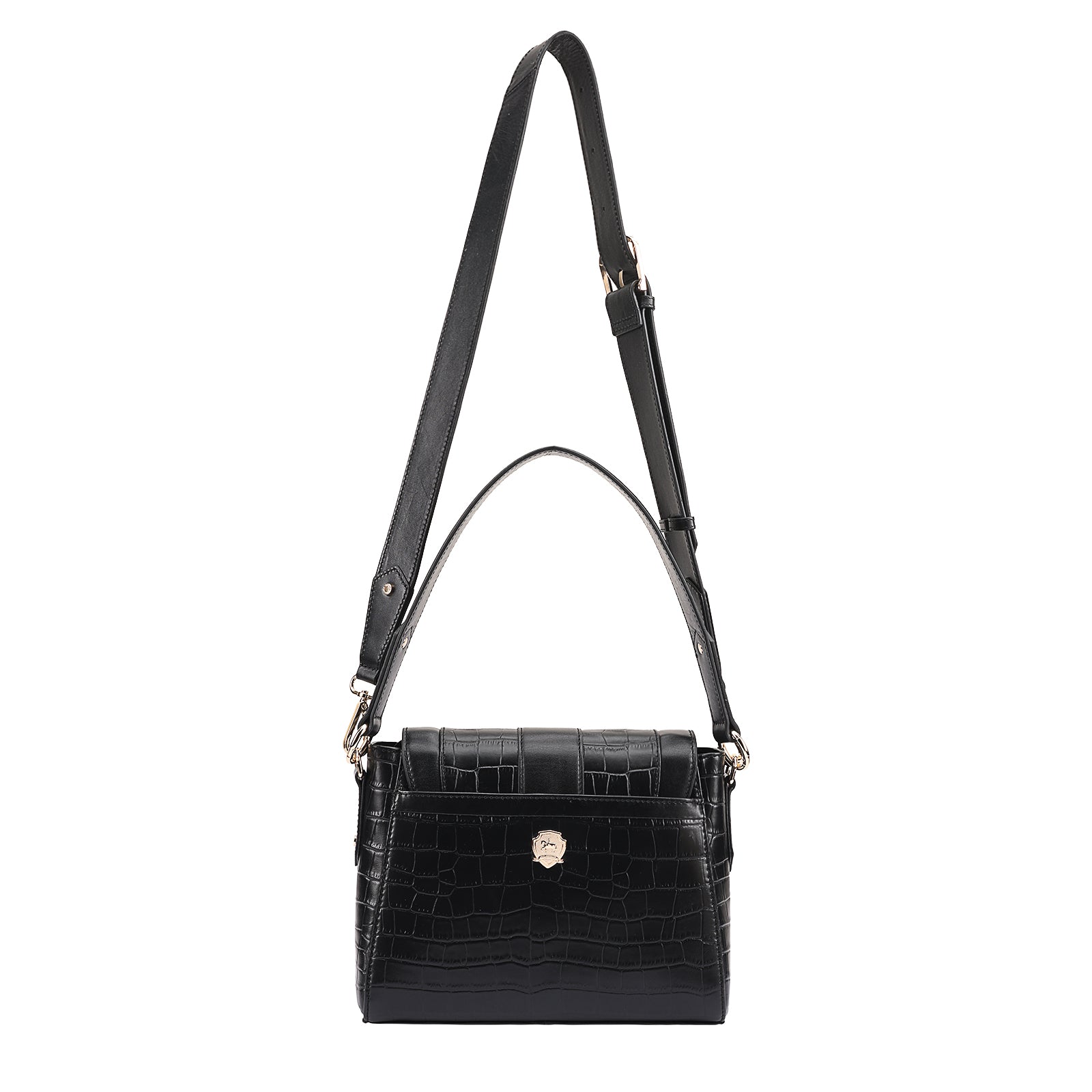 This chic leather shoulder bag is a versatile, multi-carry statement piece crafted from premium croc-embossed leather. Designed with both function and flair, it features detachable wide straps for wearing across the body or over the shoulder with a shorter option. The structured silhouette is elevated by gleaming branded metal fittings, logos, and studs, while the clean, spacious interior—lined with a signature printed fabric—includes a secure zipped pocket and an easy-access slip pocket under the flap. Perfectly blending sophistication and practicality, it’s a great-value designer bag for both work and evening occasions.