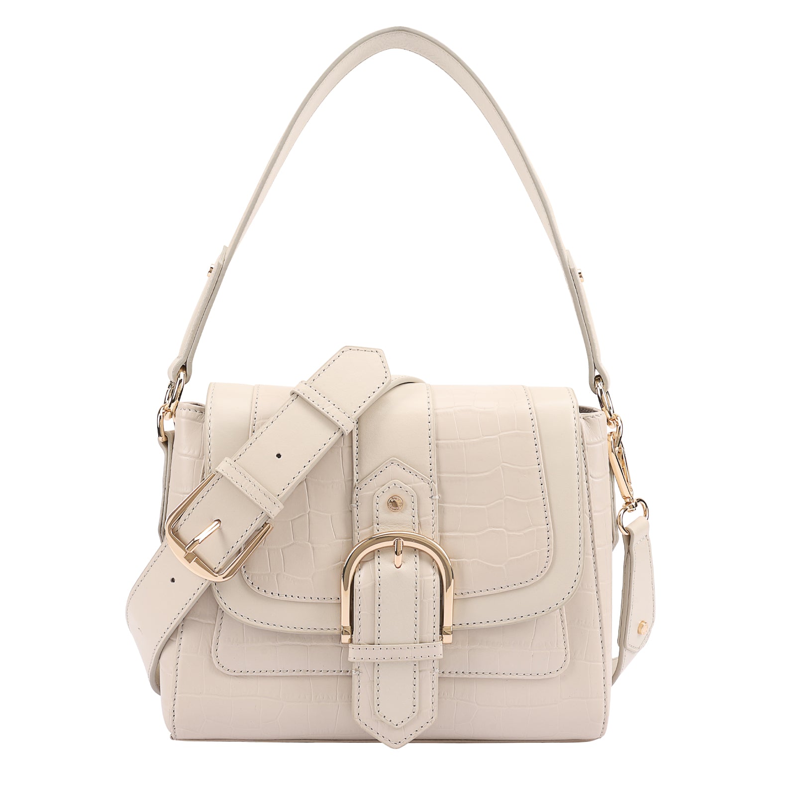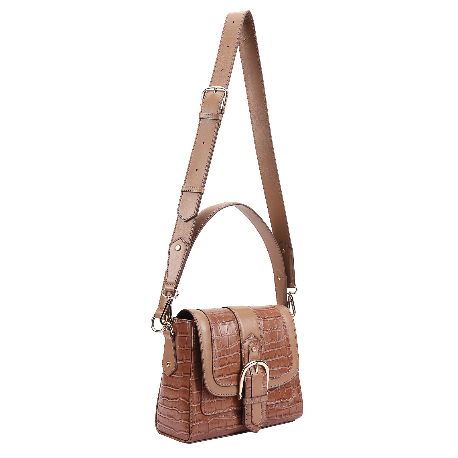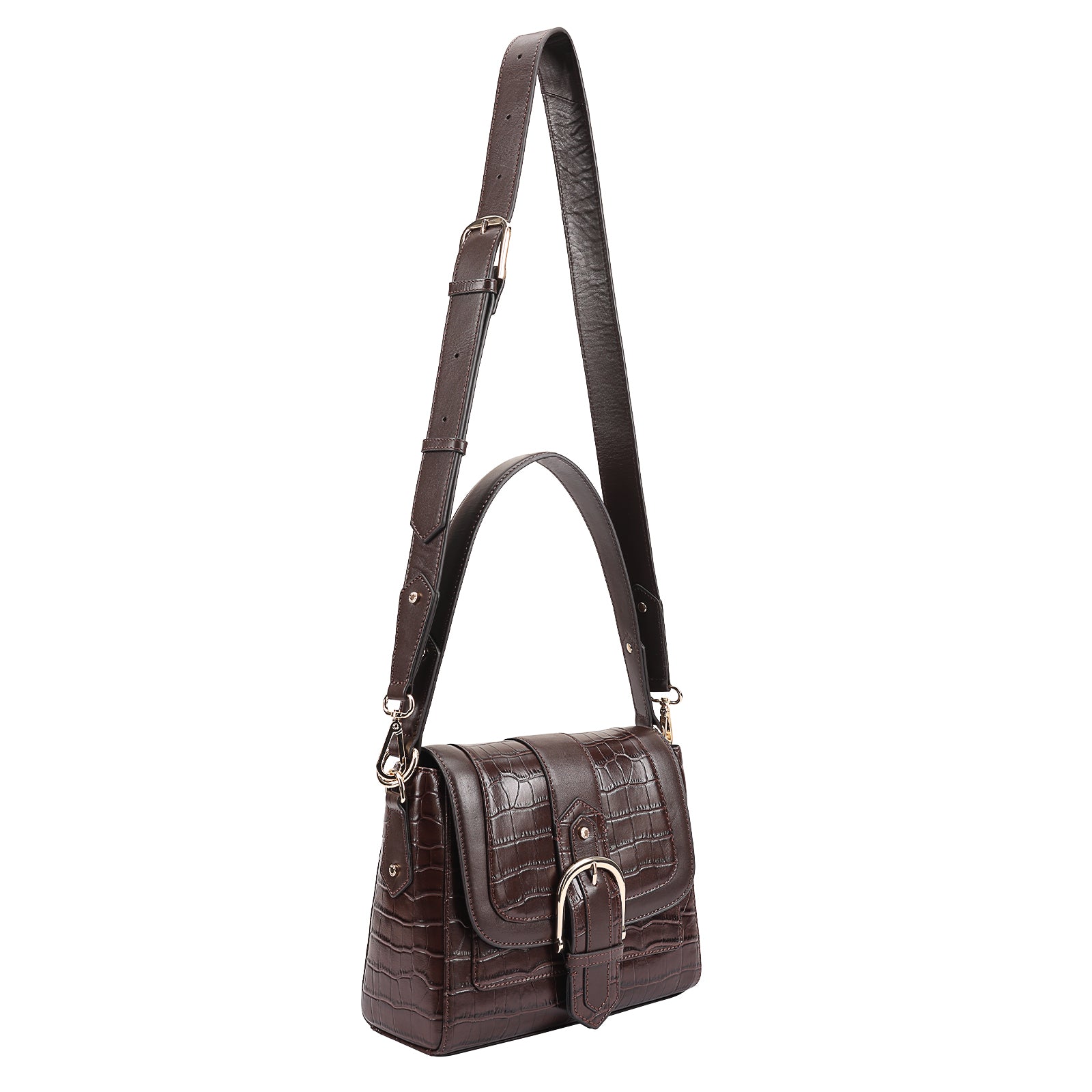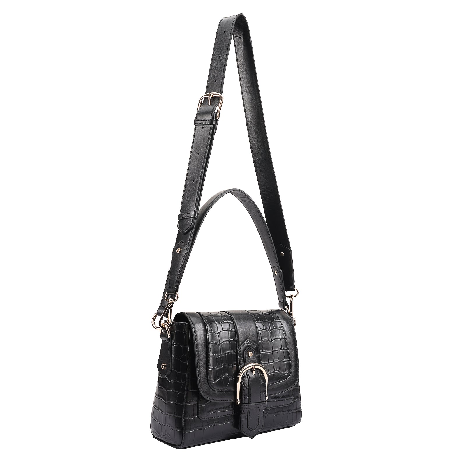 This chic leather shoulder bag is a versatile, multi-carry statement piece crafted from premium croc-embossed leather. Designed with both function and flair, it features detachable wide straps for wearing across the body or over the shoulder with a shorter option. The structured silhouette is elevated by gleaming branded metal fittings, logos, and studs, while the clean, spacious interior—lined with a signature printed fabric—includes a secure zipped pocket and an easy-access slip pocket under the flap. Perfectly blending sophistication and practicality, it’s a great-value designer bag for both work and evening occasions.