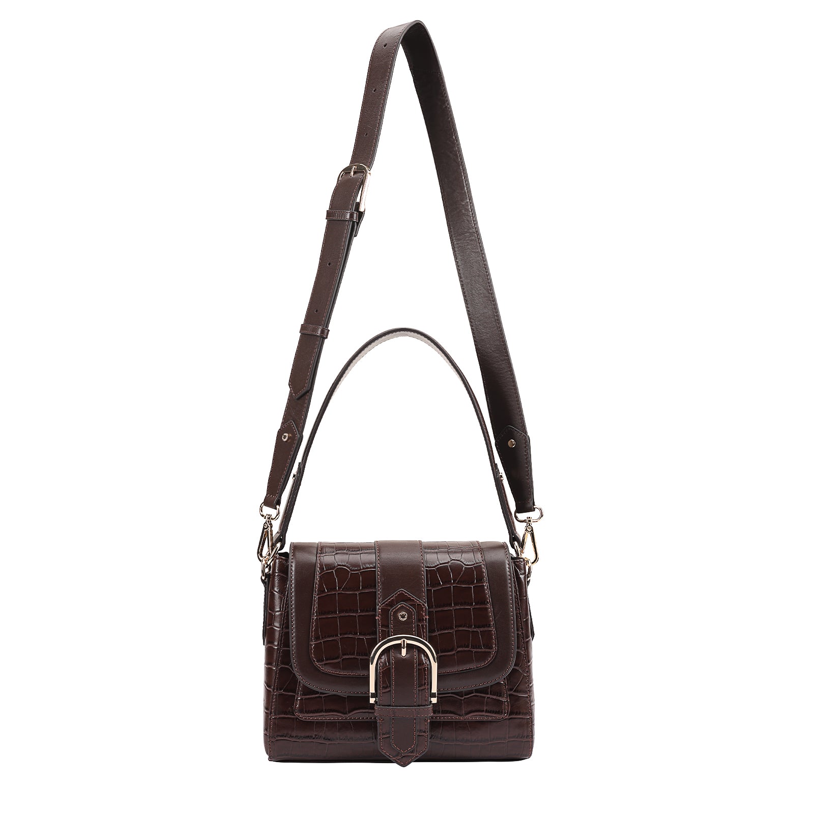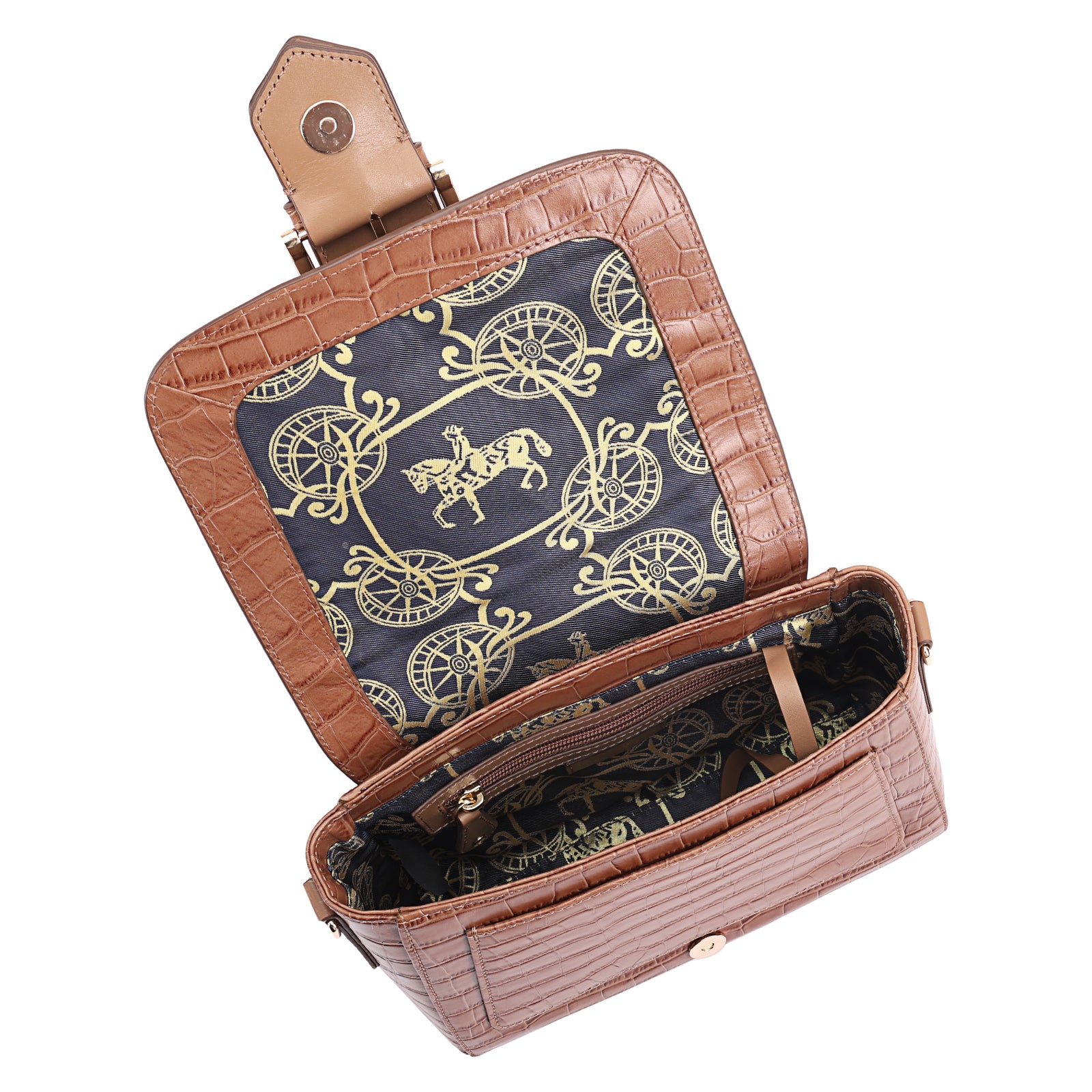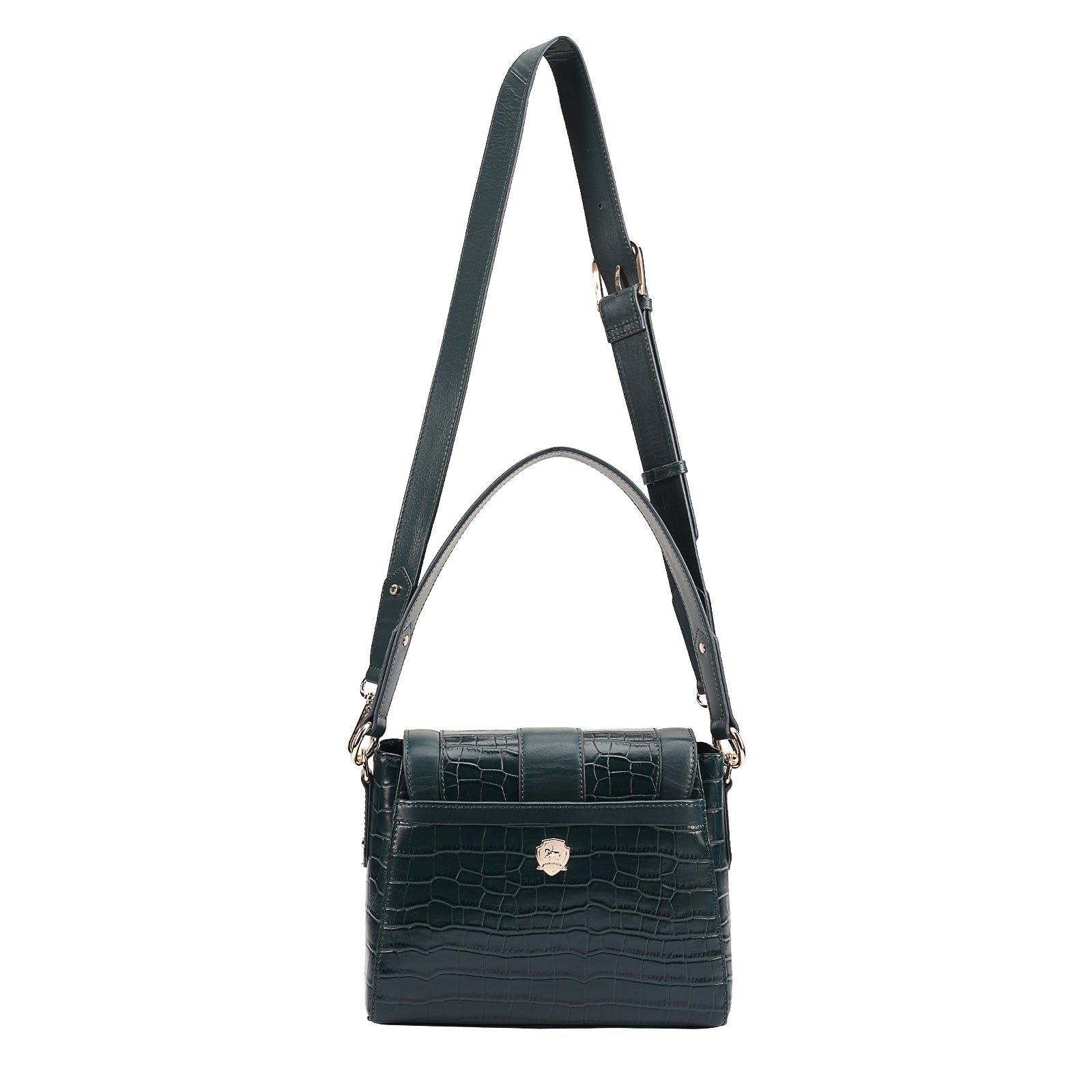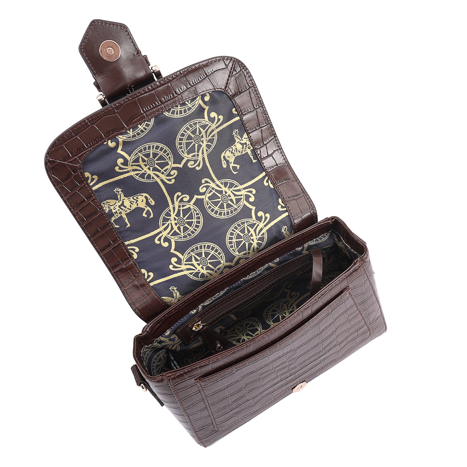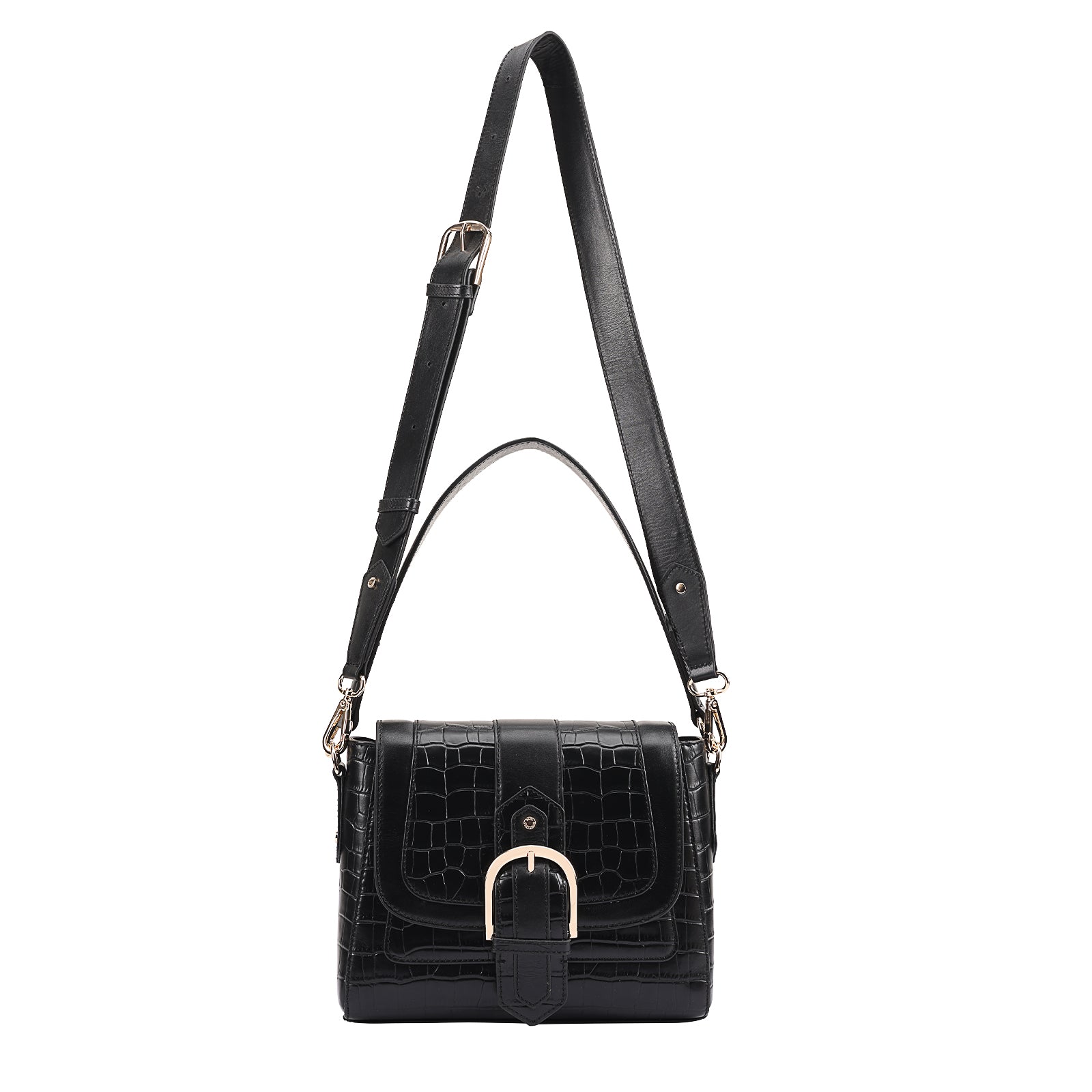 This chic leather shoulder bag is a versatile, multi-carry statement piece crafted from premium croc-embossed leather. Designed with both function and flair, it features detachable wide straps for wearing across the body or over the shoulder with a shorter option. The structured silhouette is elevated by gleaming branded metal fittings, logos, and studs, while the clean, spacious interior—lined with a signature printed fabric—includes a secure zipped pocket and an easy-access slip pocket under the flap. Perfectly blending sophistication and practicality, it’s a great-value designer bag for both work and evening occasions.