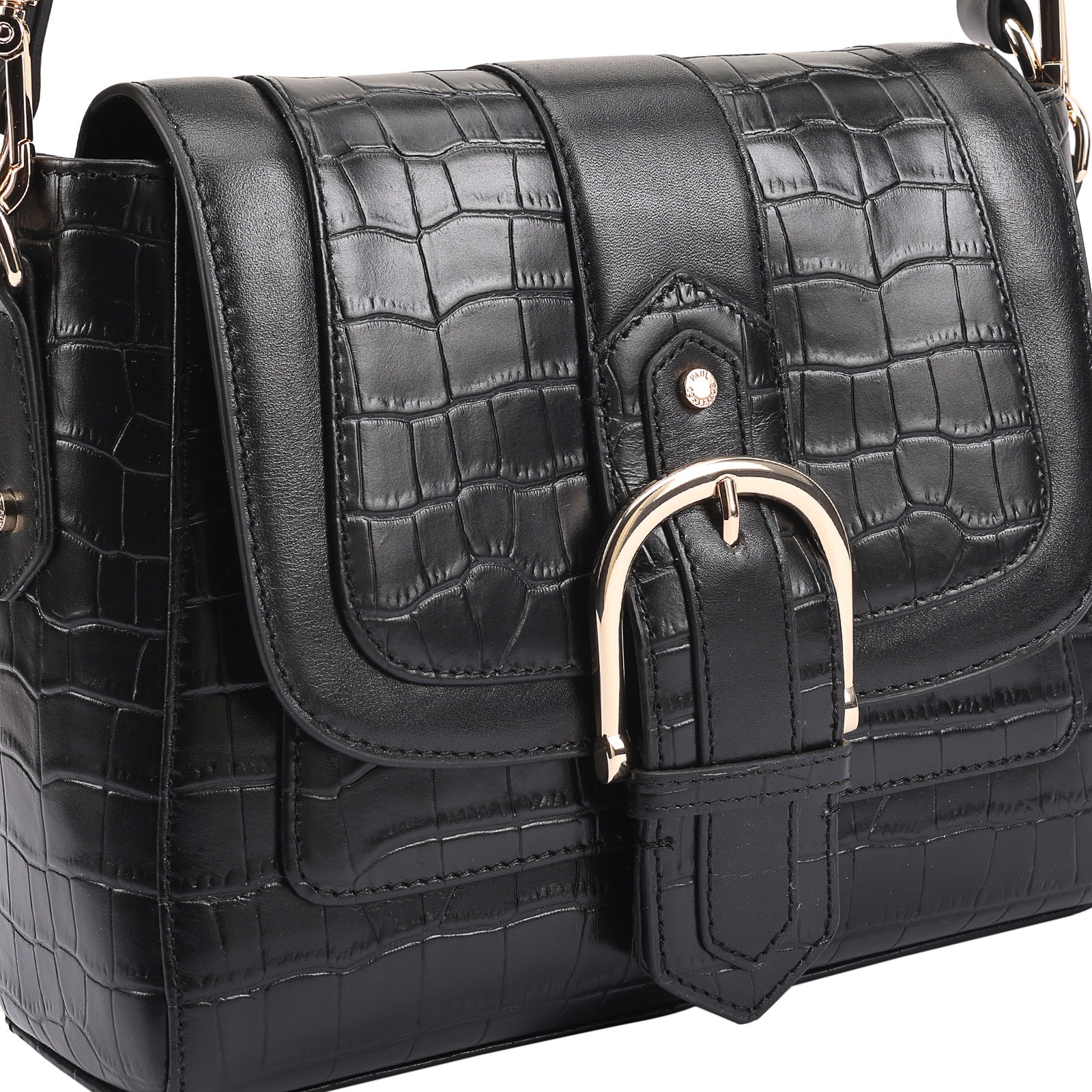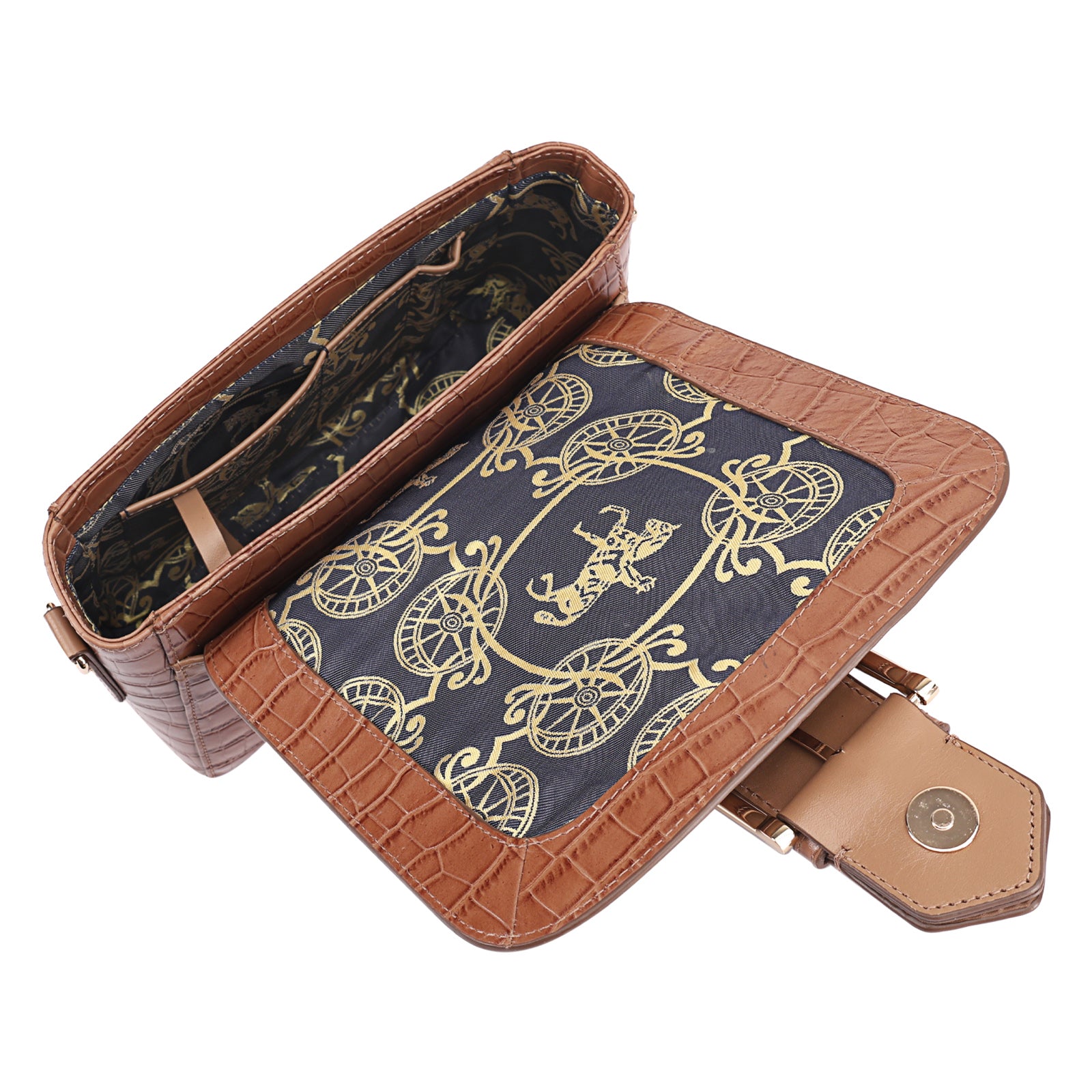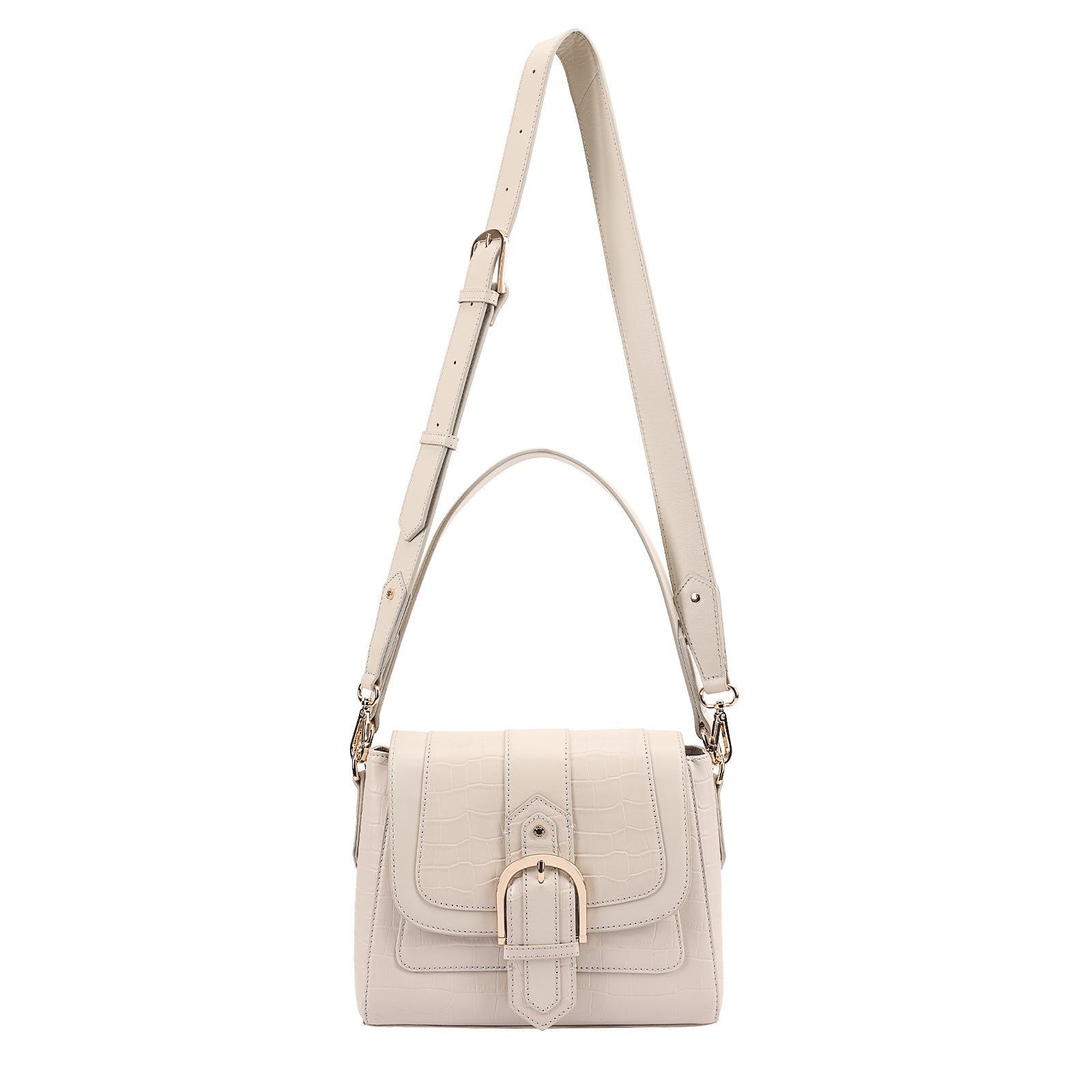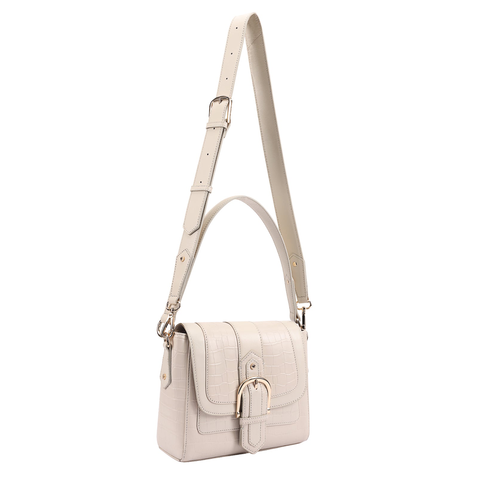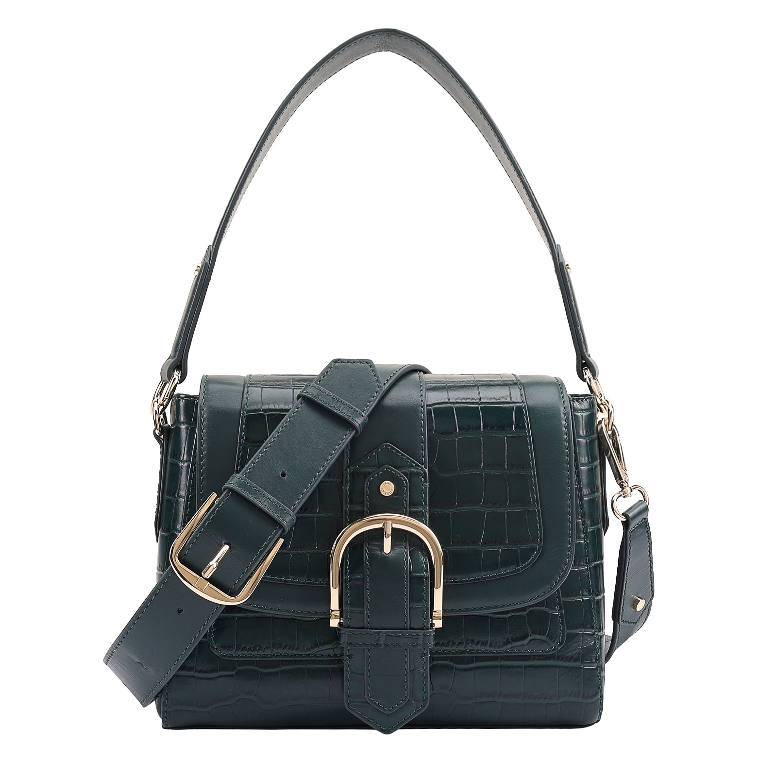 This chic leather shoulder bag is a versatile, multi-carry statement piece crafted from premium croc-embossed leather. Designed with both function and flair, it features detachable wide straps for wearing across the body or over the shoulder with a shorter option. The structured silhouette is elevated by gleaming branded metal fittings, logos, and studs, while the clean, spacious interior—lined with a signature printed fabric—includes a secure zipped pocket and an easy-access slip pocket under the flap. Perfectly blending sophistication and practicality, it’s a great-value designer bag for both work and evening occasions.