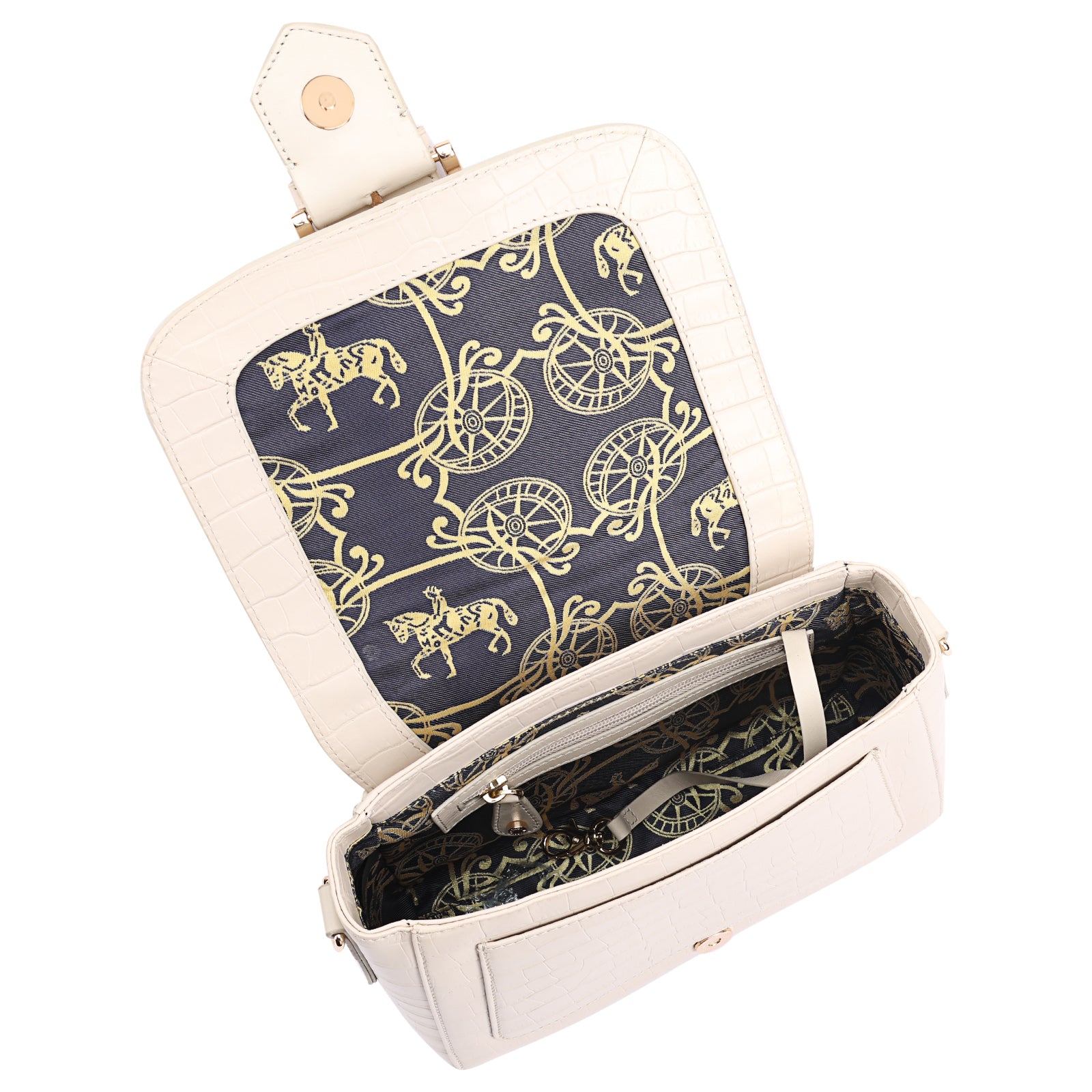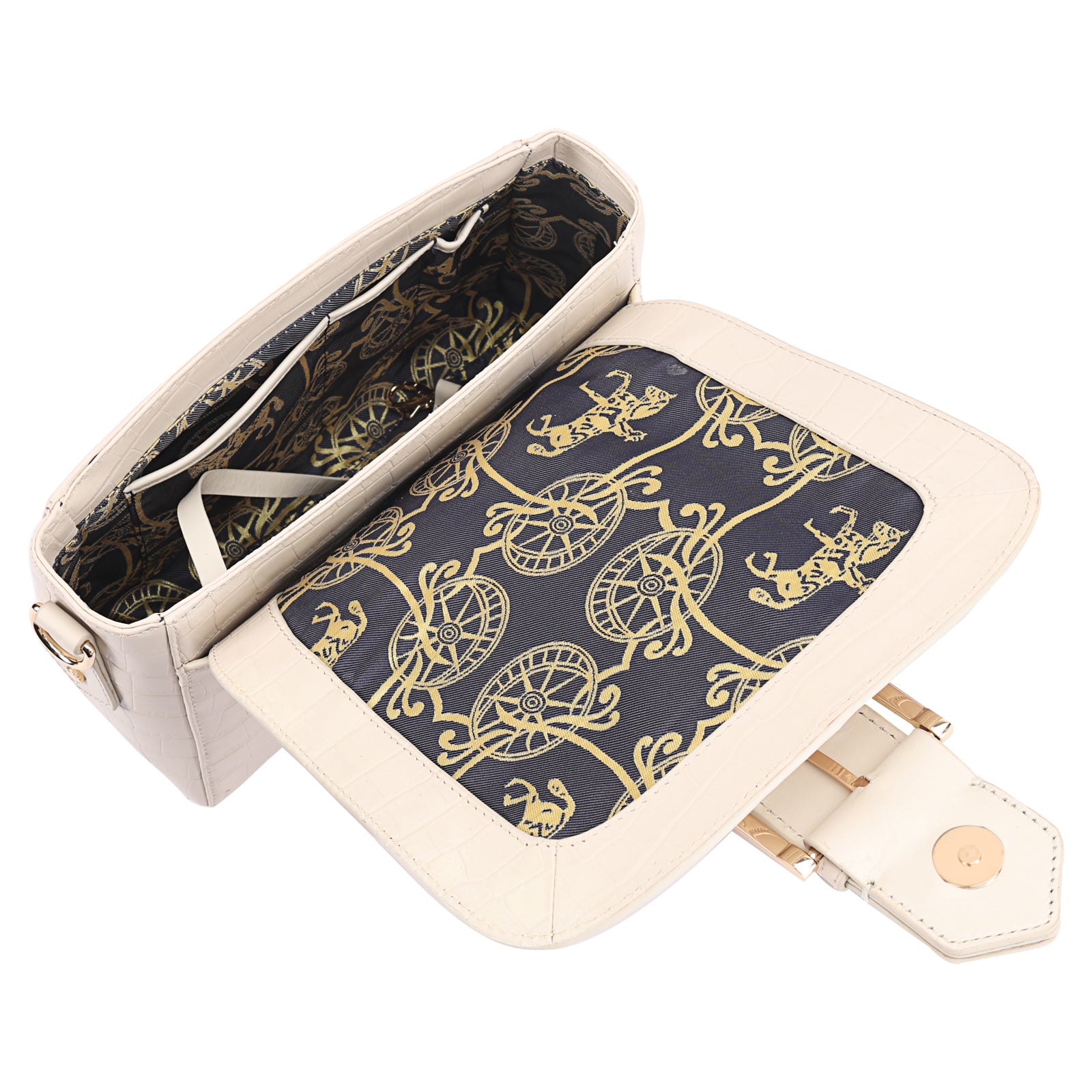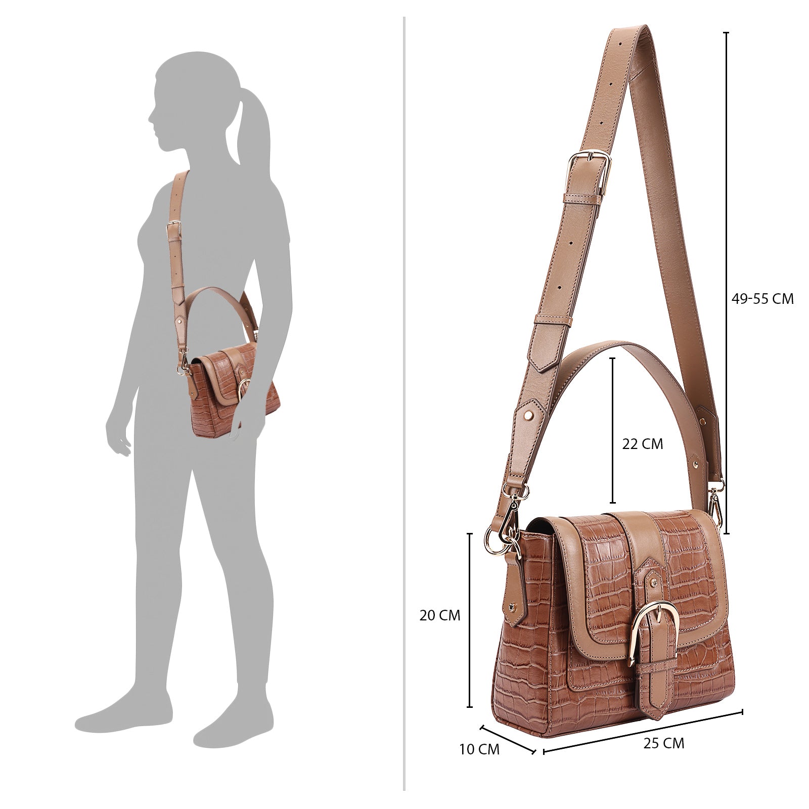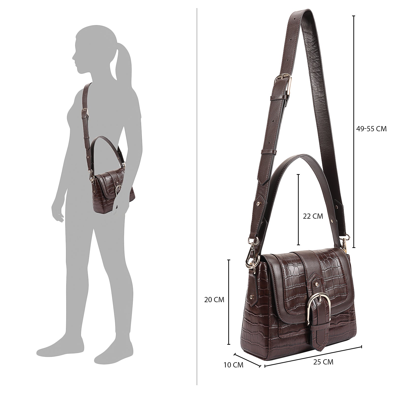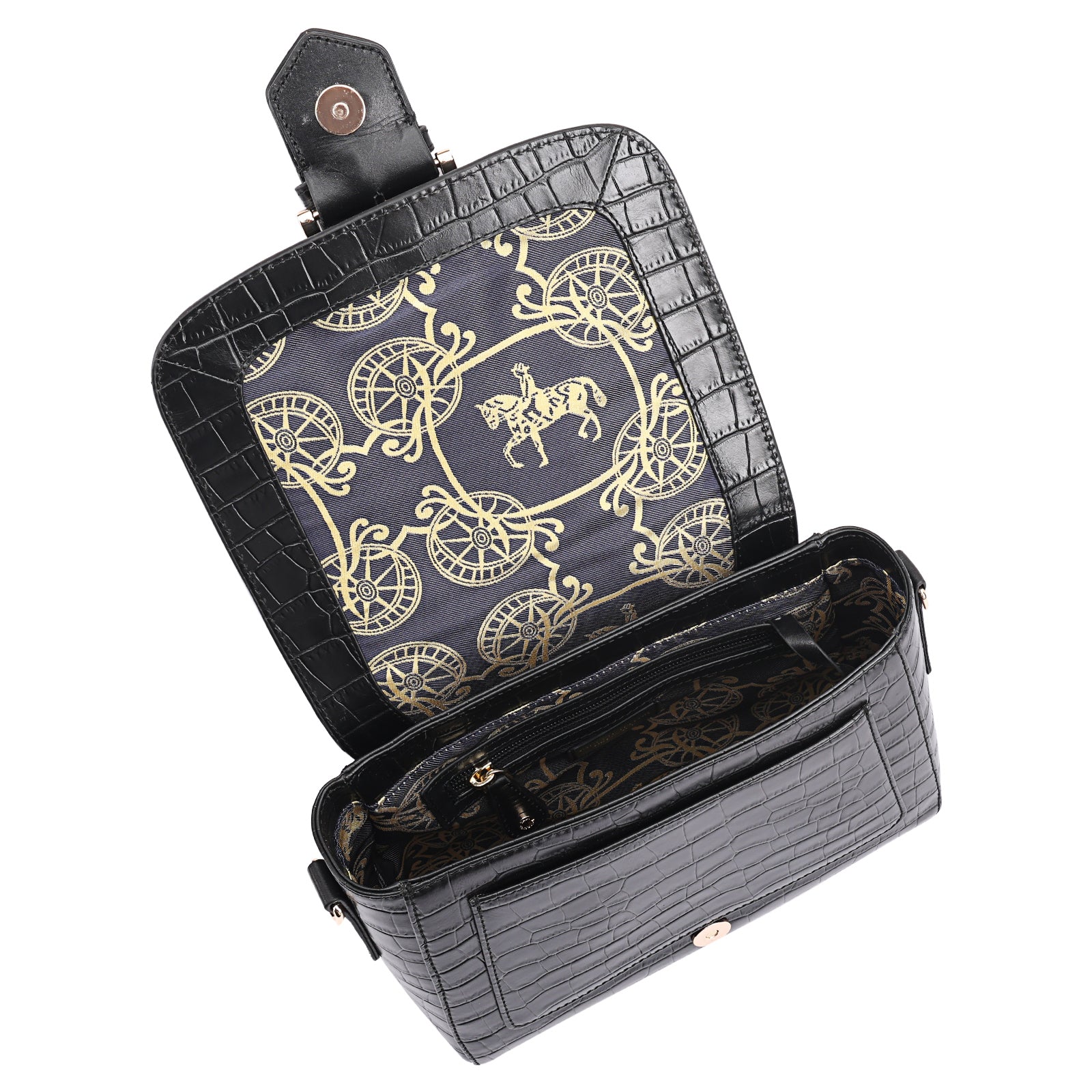 This chic leather shoulder bag is a versatile, multi-carry statement piece crafted from premium croc-embossed leather. Designed with both function and flair, it features detachable wide straps for wearing across the body or over the shoulder with a shorter option. The structured silhouette is elevated by gleaming branded metal fittings, logos, and studs, while the clean, spacious interior—lined with a signature printed fabric—includes a secure zipped pocket and an easy-access slip pocket under the flap. Perfectly blending sophistication and practicality, it’s a great-value designer bag for both work and evening occasions.