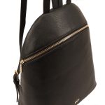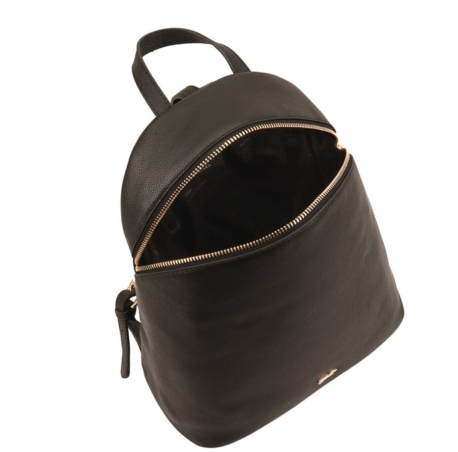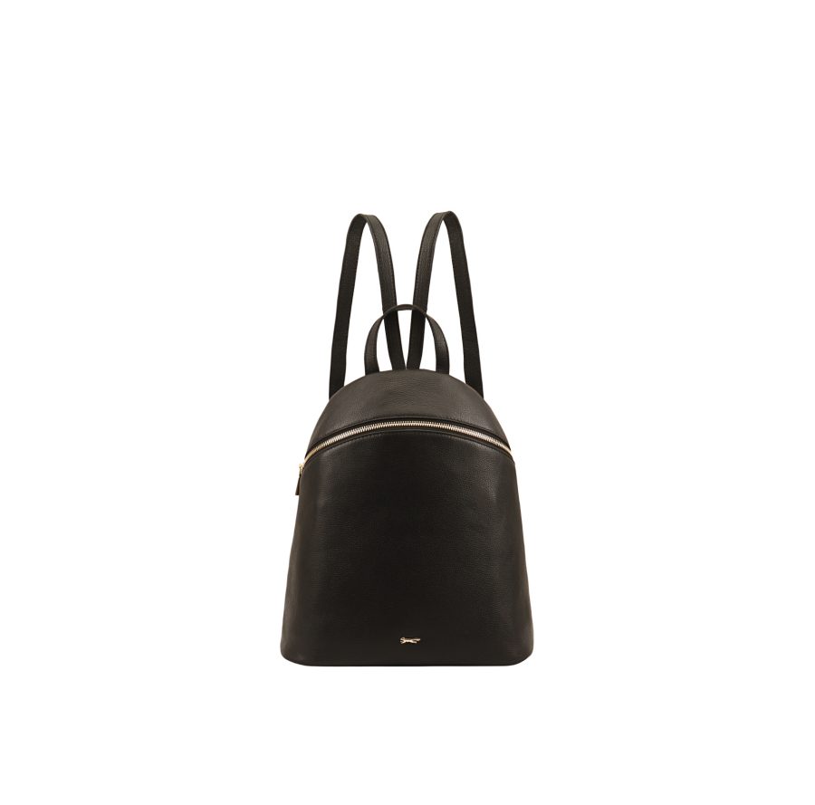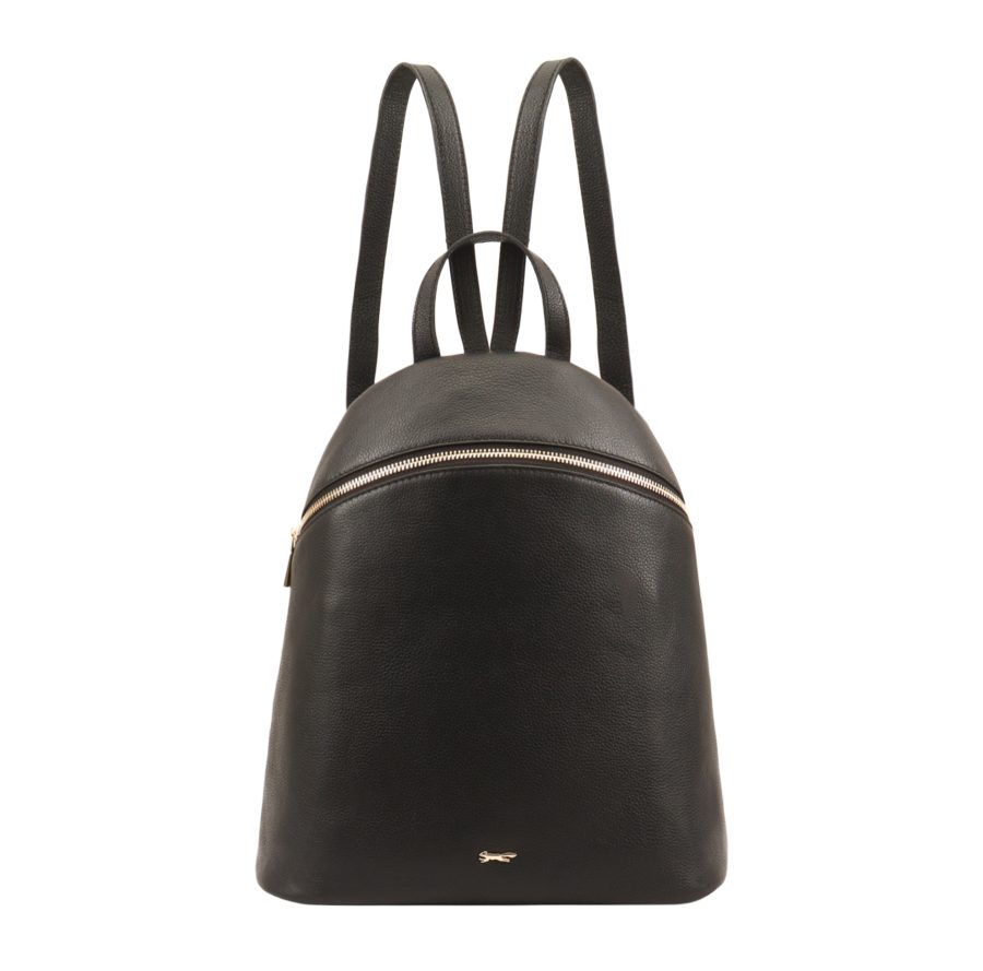 This sleek leather backpack exudes modern elegance with its minimalist design and refined details. The front zip opening, adorned with an elegant logo pin, offers easy access to a clean, spacious interior, complete with a slip pocket for effortless organization.
