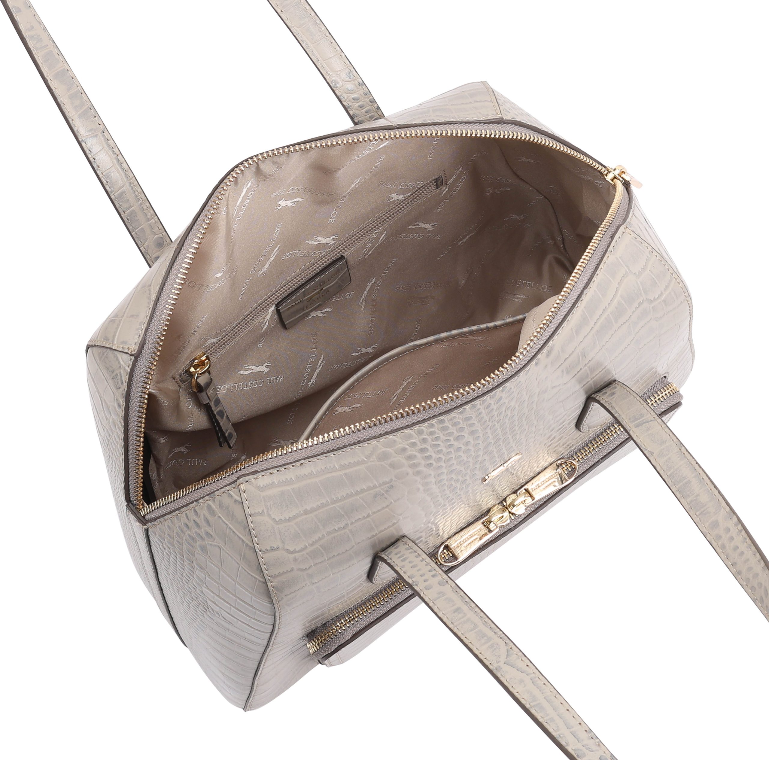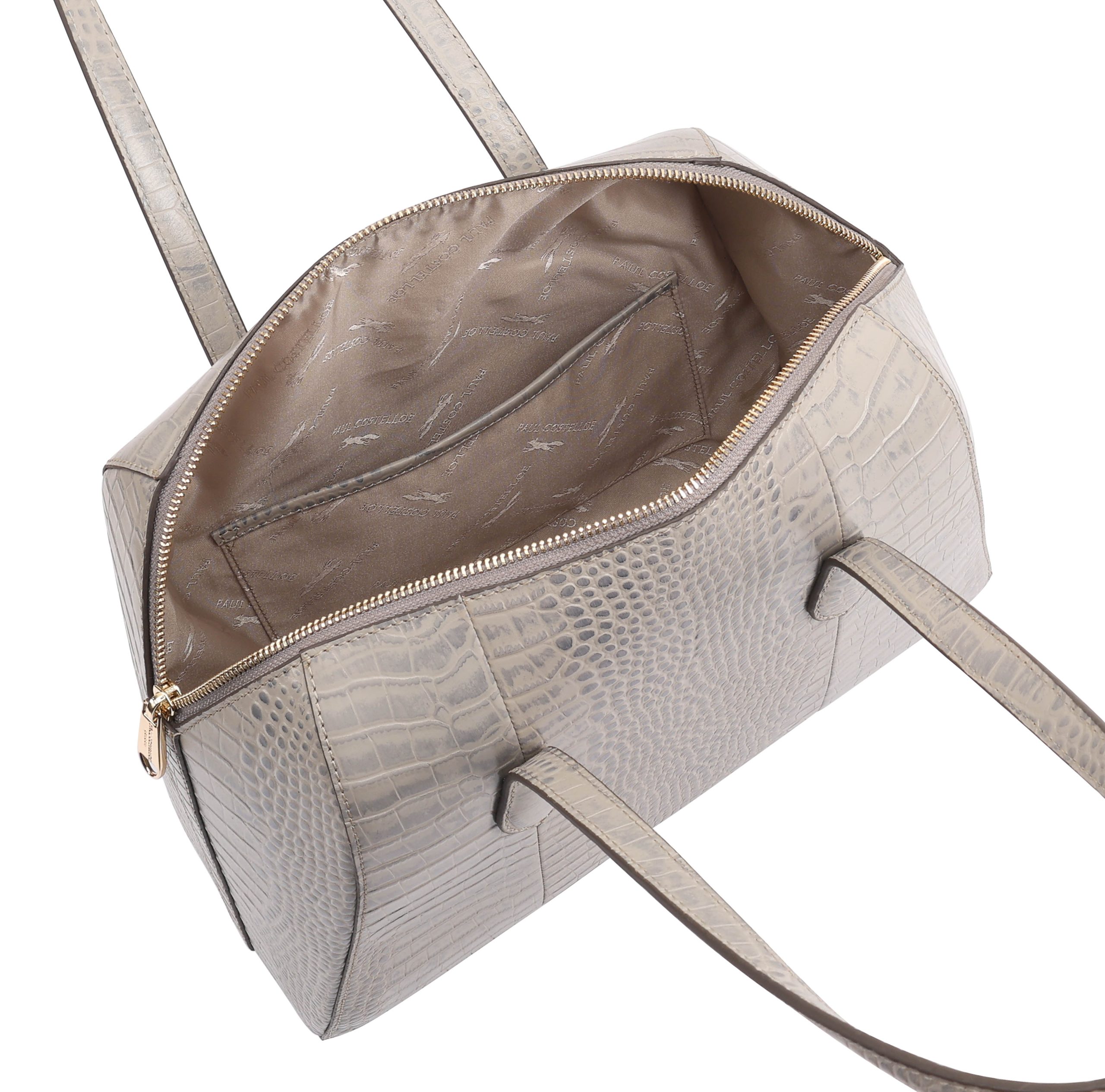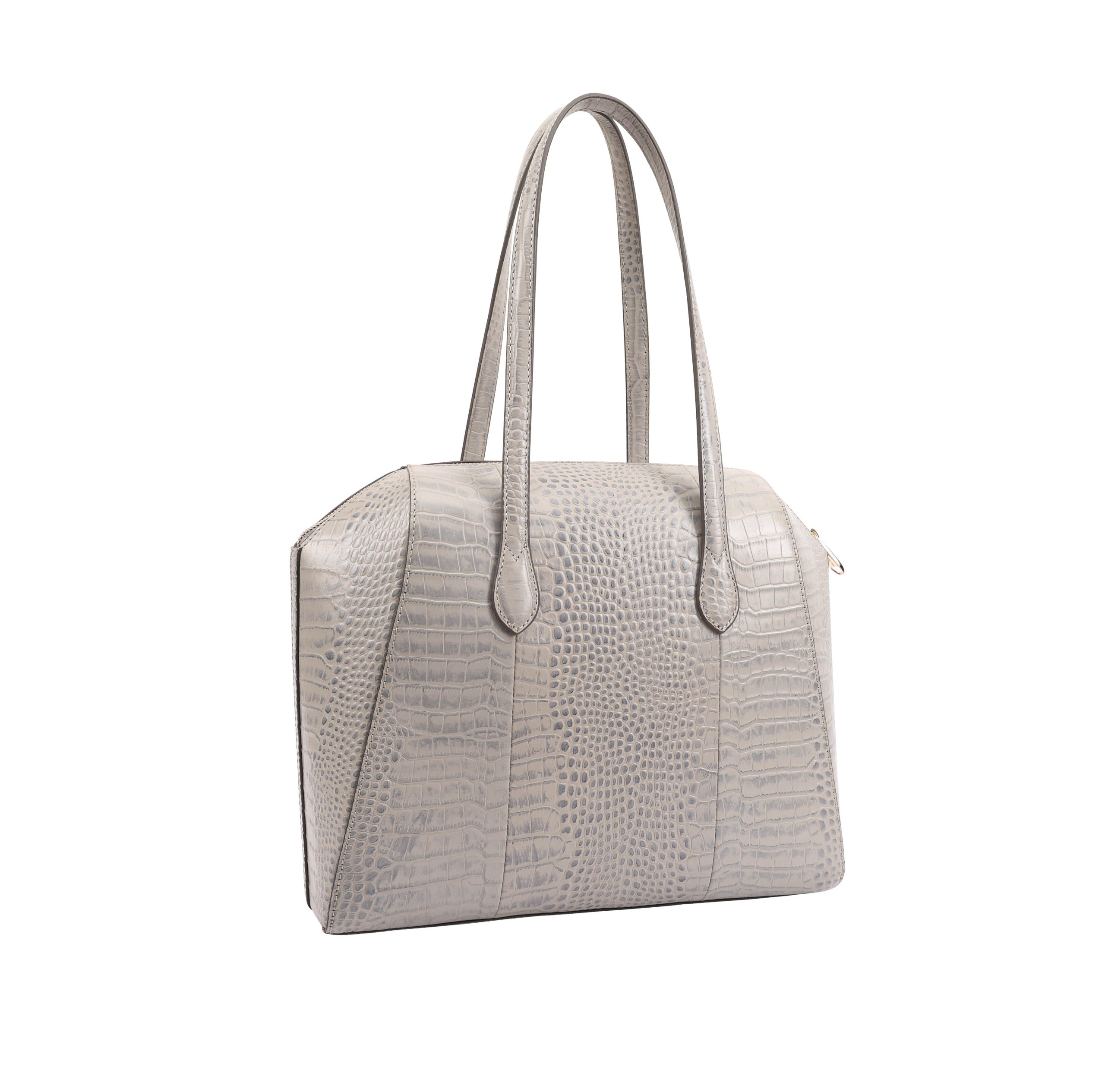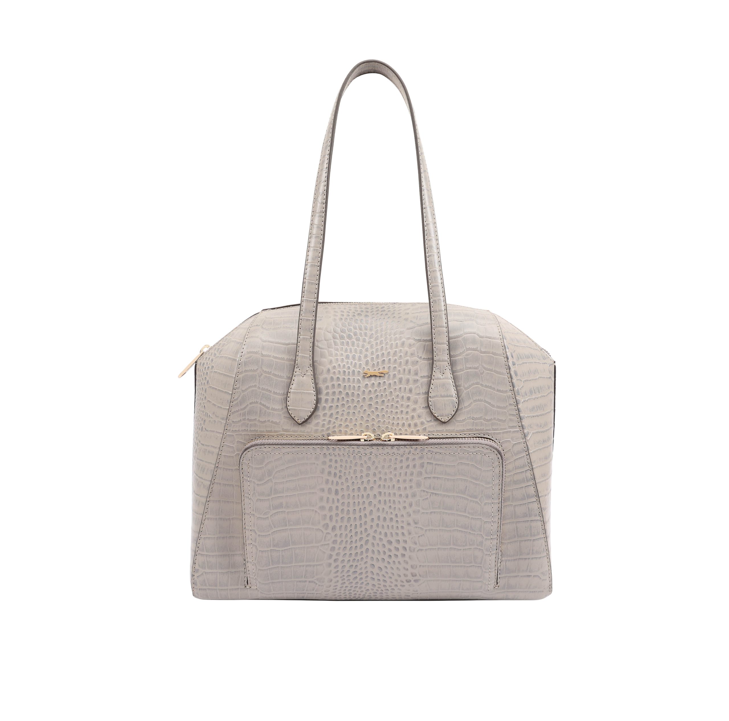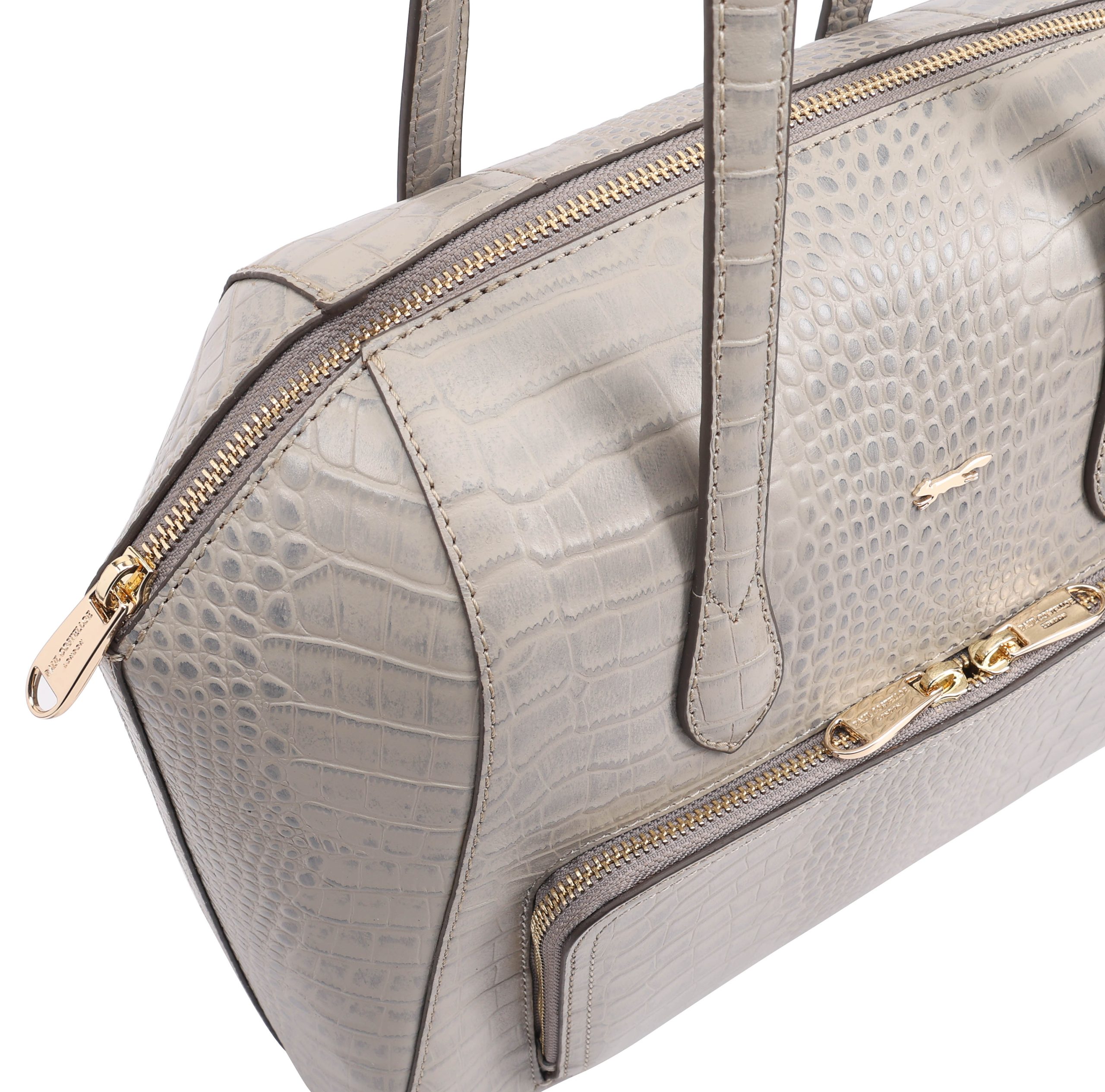 This stylish leather handbag, crafted from classic croc-embossed leather, boasts a unique boxed shape that maximizes space for everyday essentials. It features a convenient double-zip front pocket and a spacious interior with internal zip and slip pockets on either side, keeping everything organized and easily accessible. Perfect for daily use, this bag combines functionality with a chic, timeless look.