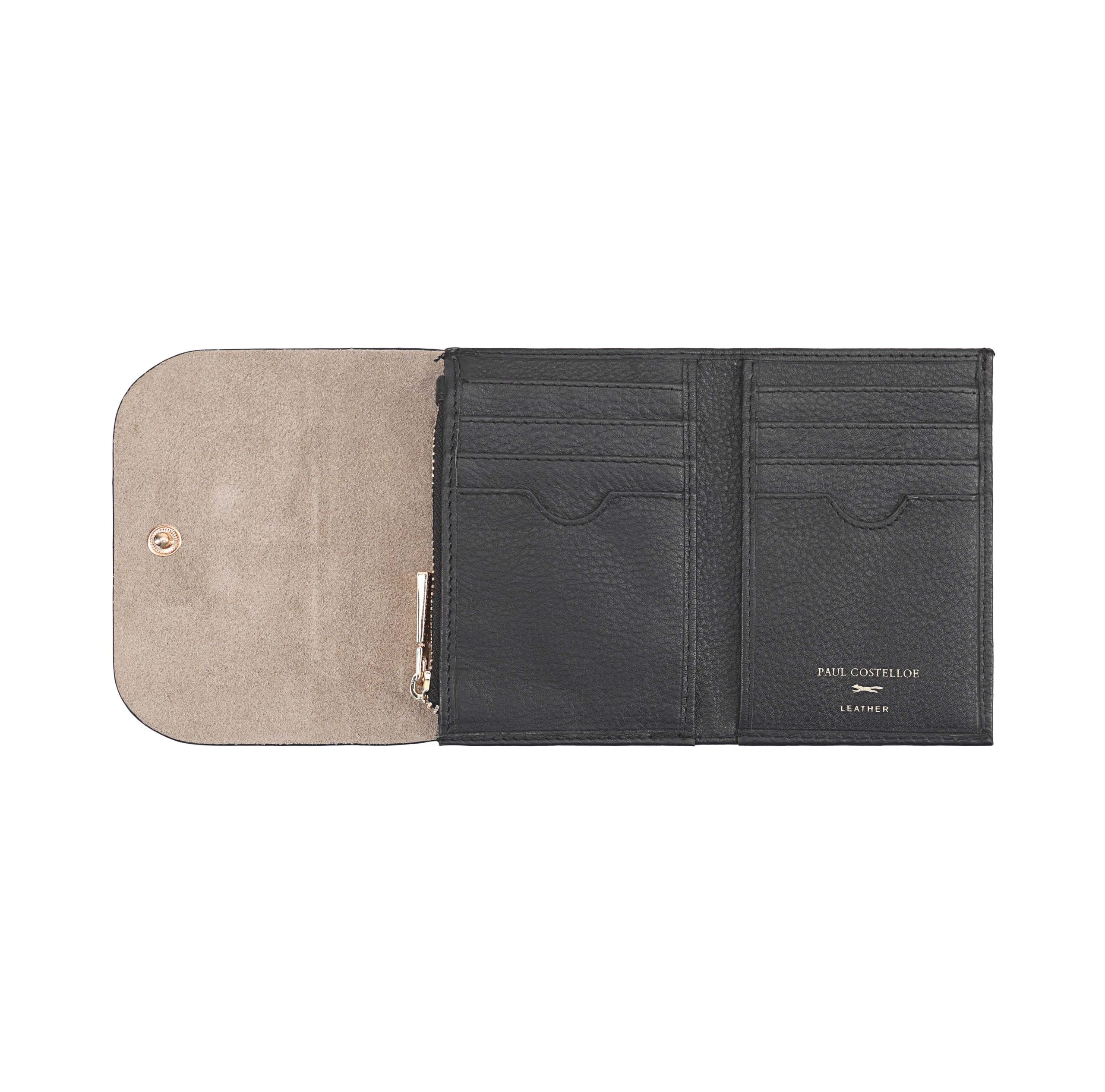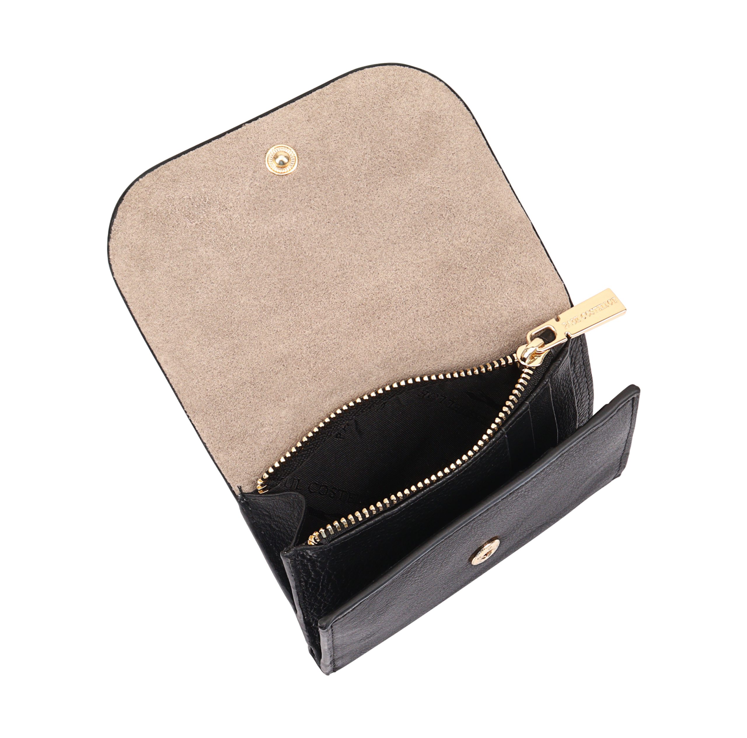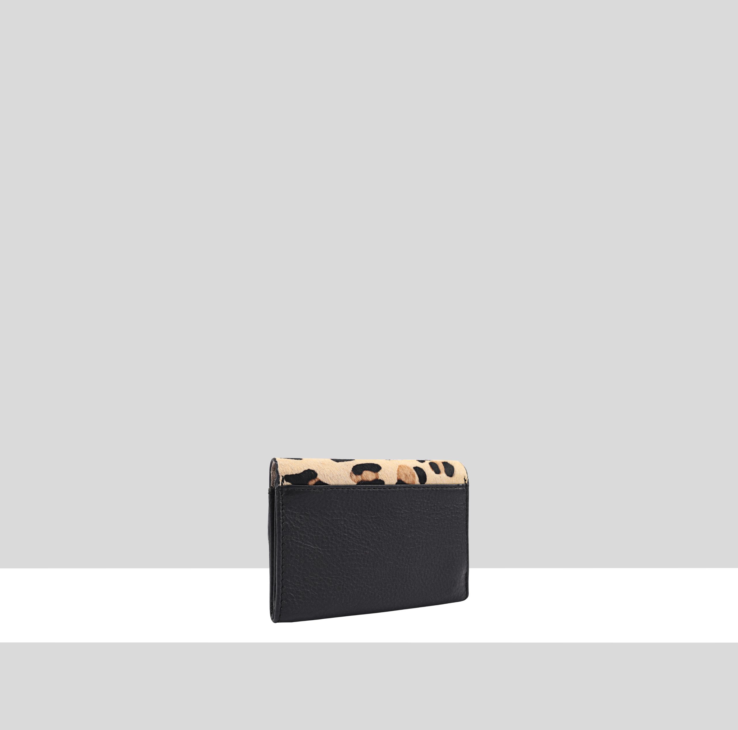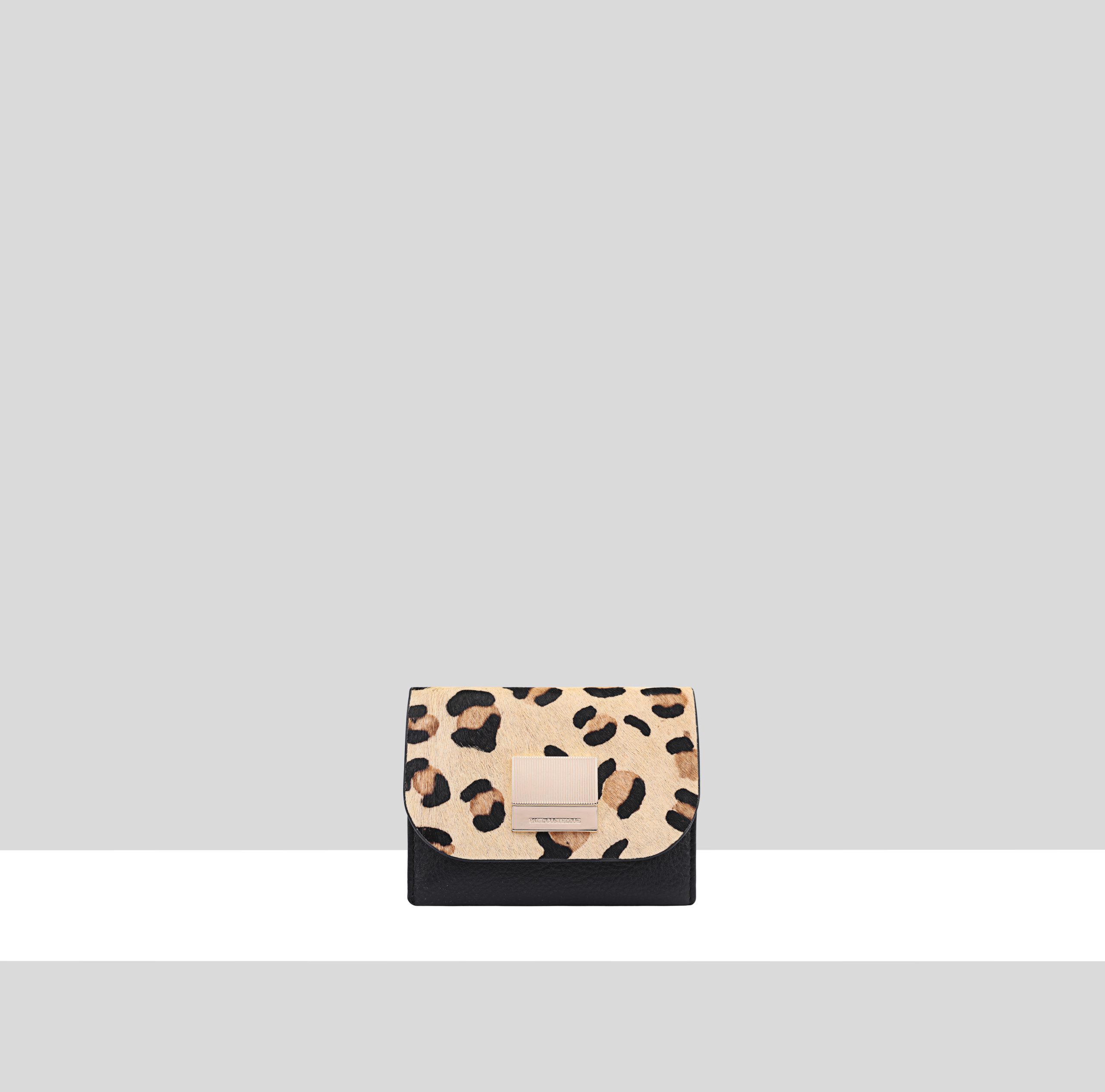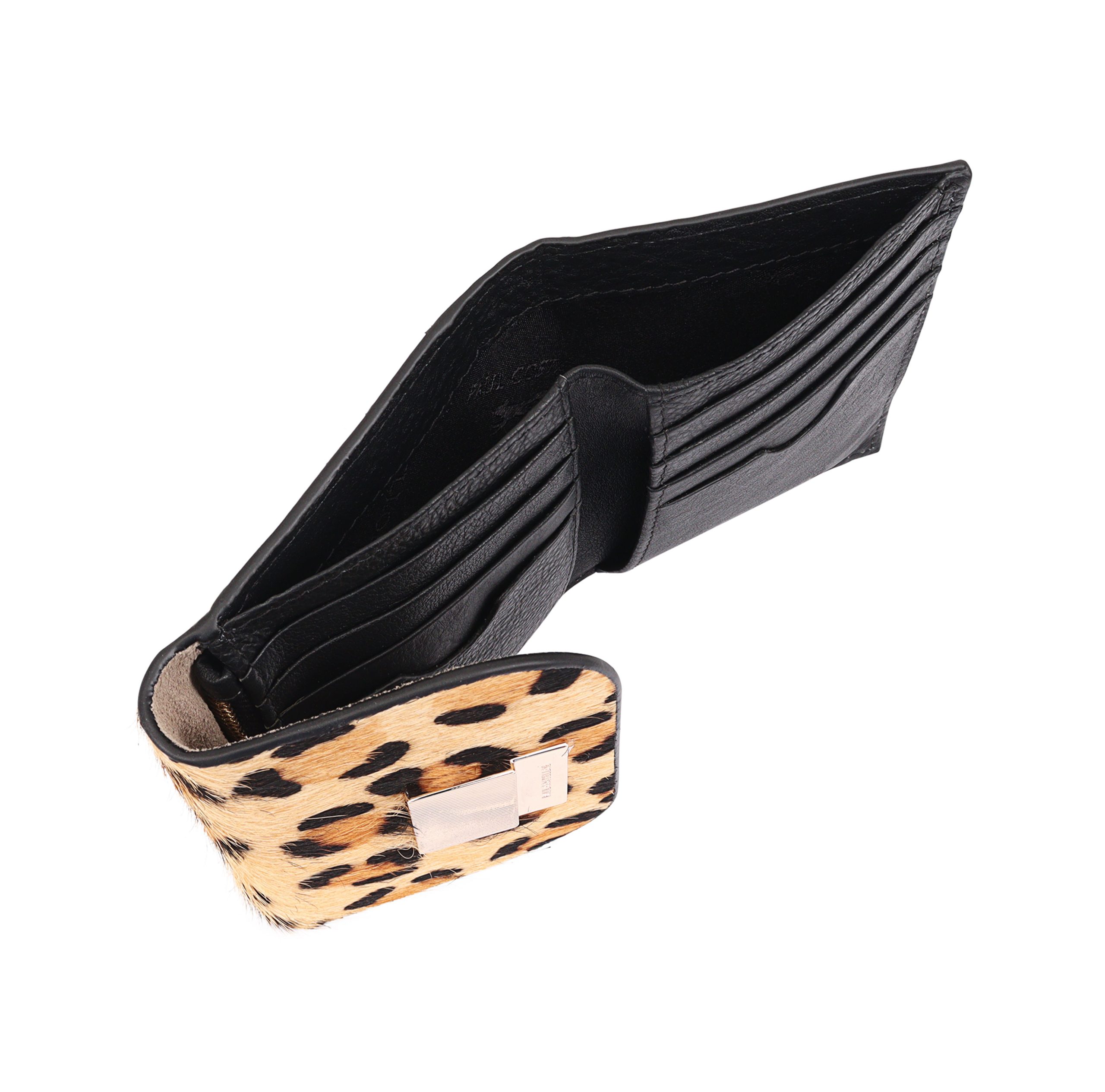 A compact and elegant small flap-over card and coin purse crafted from premium hair-on leather. Designed for both style and functionality, it features a secure flap closure and a sleek metal brand logo plate on the front, adding a touch of sophistication. Perfect for carrying essentials with ease.